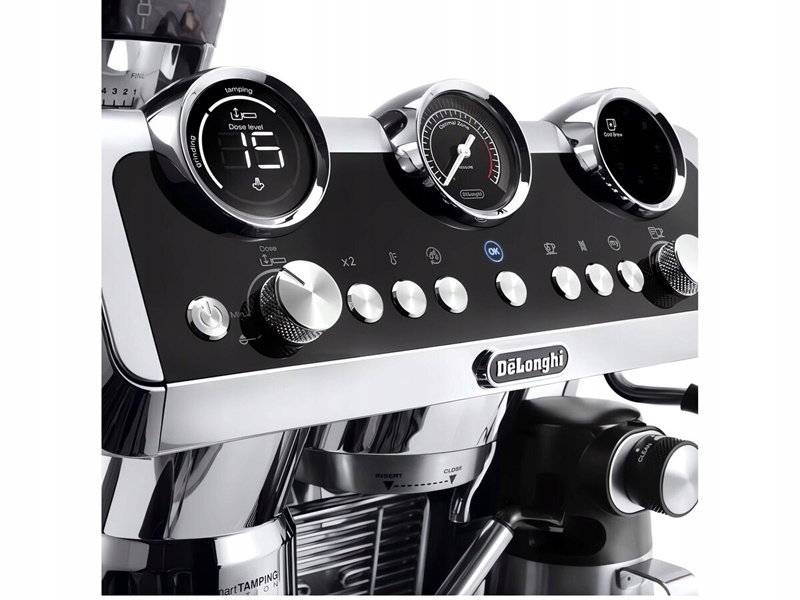 - Powierzchnia ekspresu do kawy De’Longhi wykonana jest ze stali nierdzewnej, co doskonale współgra z jego chromowanymi detalami.