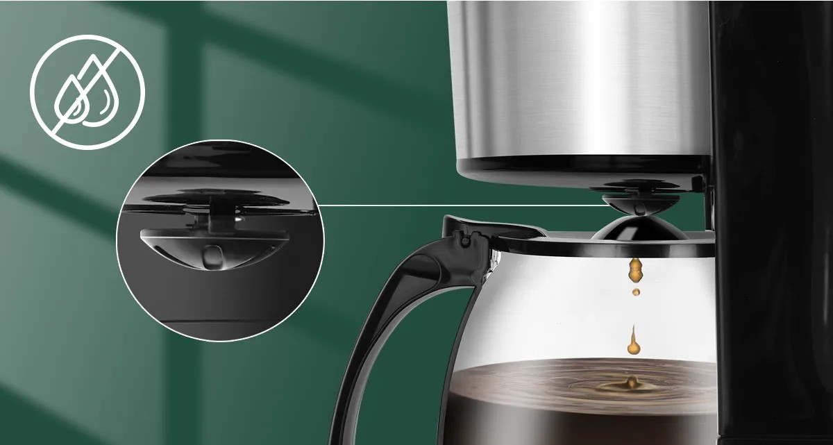 Funkcja ochrony przed przeciekaniem Konstrukcja zapobiegająca kapaniu: przy wyjęciu dzbanka podczas parzenia, płyn przestaje kapać, jest to bezpieczne i wygodne rozwiązanie, które pozwala na nalewanie kawy w dowolnym momencie.