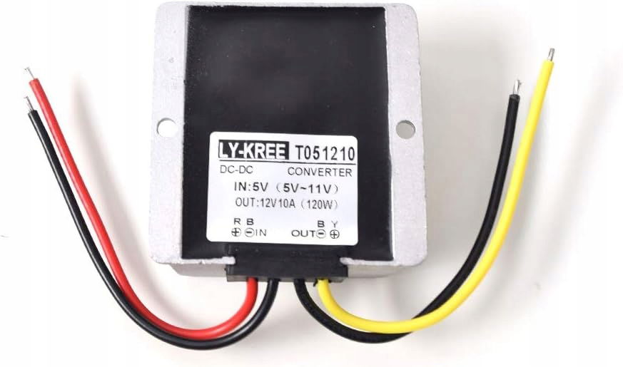Przetwornica podwyższająca napięcie DC 5 V do DC 12 V. Szeroki zakres napięcia wejściowego 5–11 V, napięcie wyjściowe 12 V, maks. prąd 10 A, 120 W.
