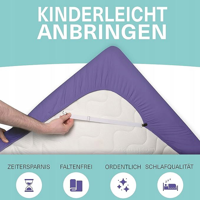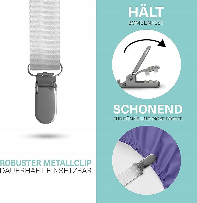 - Niezwykła siła – stabilne klipsy z wytrzymałego metalu na pewno utrzymają prześcieradło na miejscu. Pasy napinające prześcieradła są przy tym bardzo delikatne dla Twoich tekstyliów.