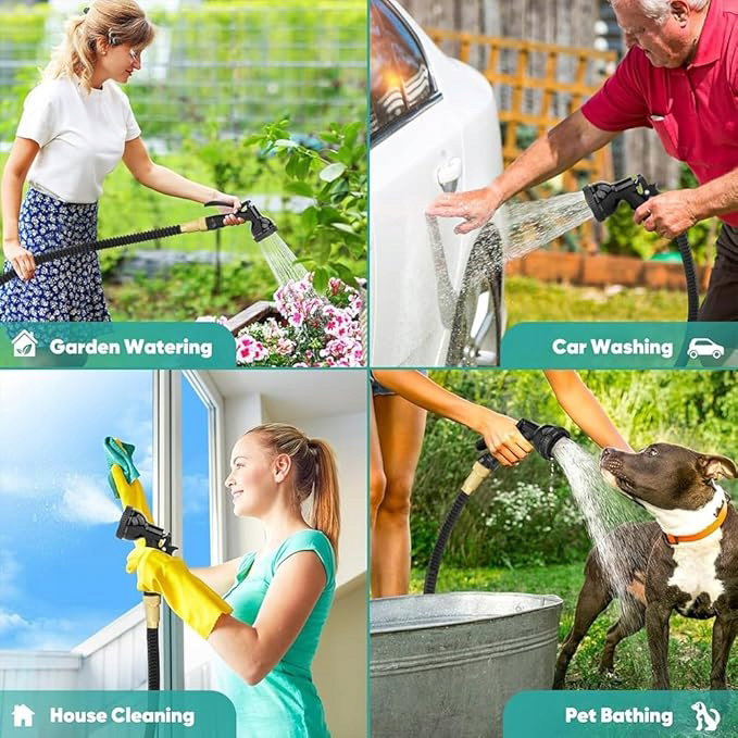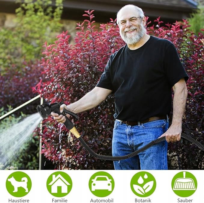 Wąż wielofunkcyjny: rozszerzalna długość i prawidłowy przepływ wody, wspierający wiele zastosowań, spełniając wszystkie potrzeby podlewania i czyszczenia oraz sprzątania: ogród, podłogi, trawnik, zwierzęta, basen, myjnia samochodowa i inne.