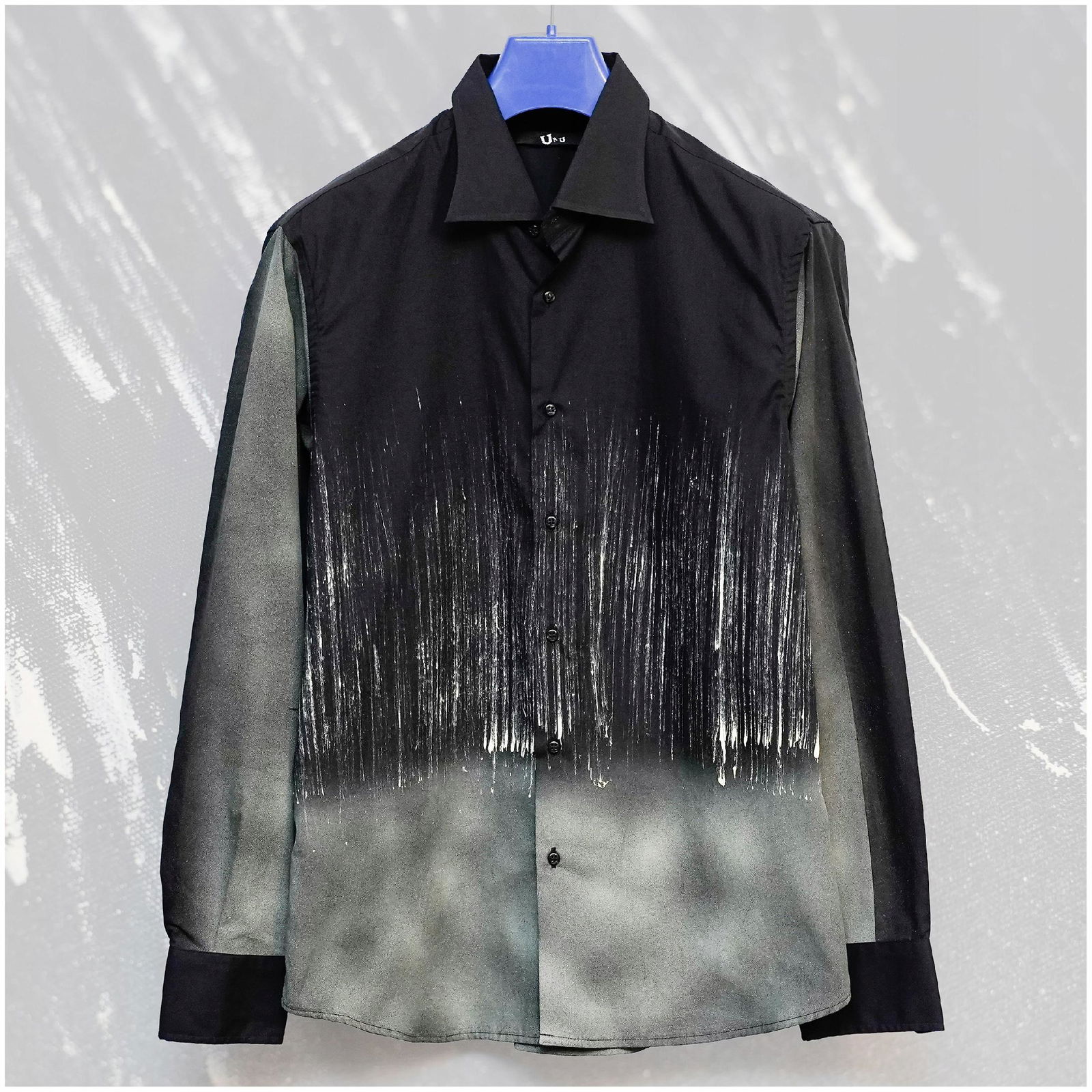 Elegancka designerska męska koszula. Struktura drobnego piasku na całości z motywem plam farby.