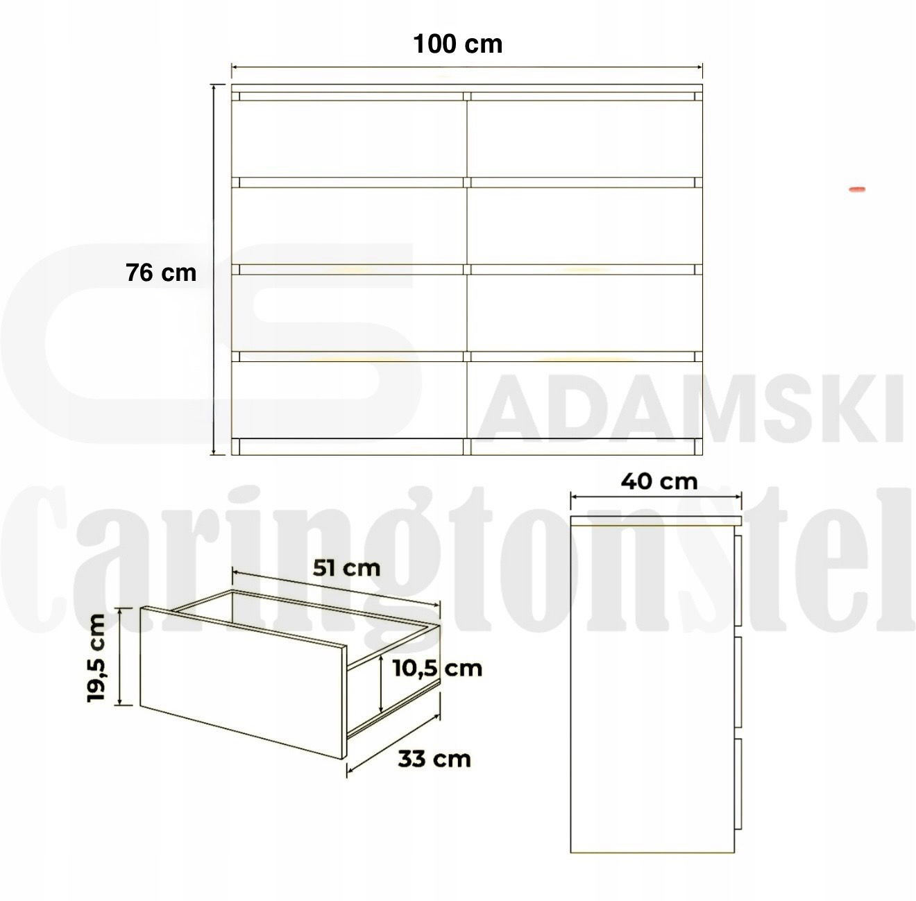 - Optymalne wymiary – szerokość 100 cm, wysokość 75 cm, głębokość 40 cm, co sprawia, że komoda nie zajmuje dużo miejsca, a jednocześnie oferuje sporo przestrzeni do przechowywania.