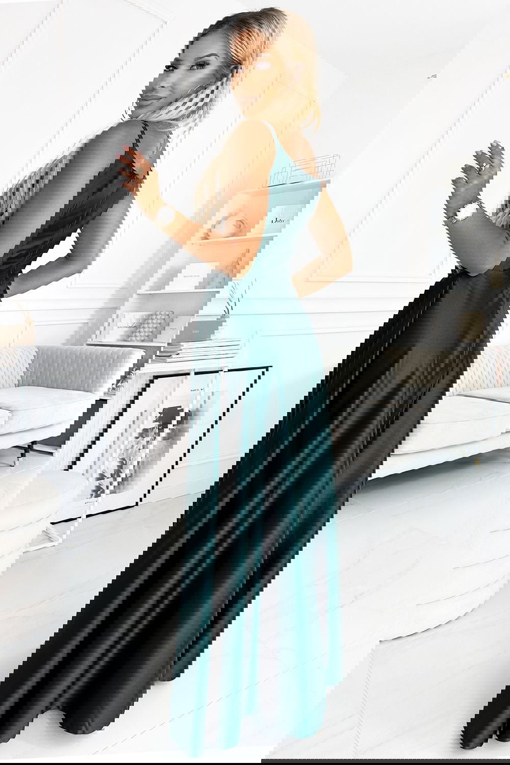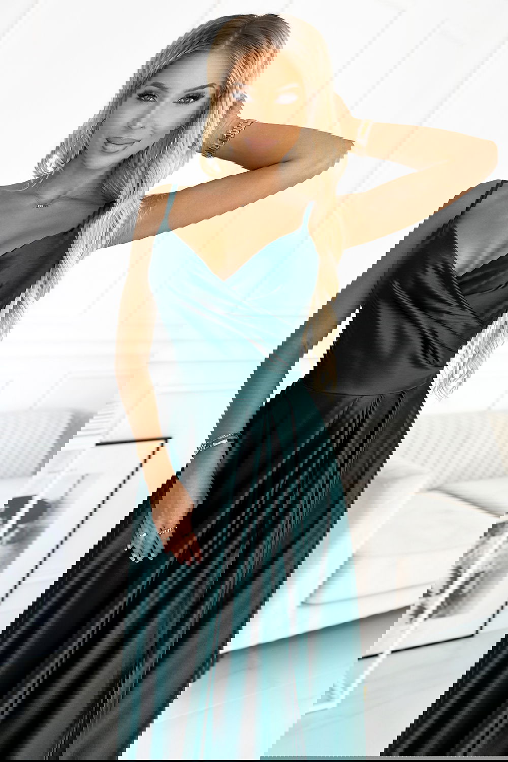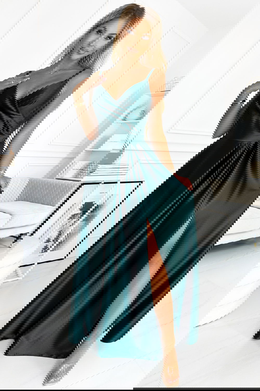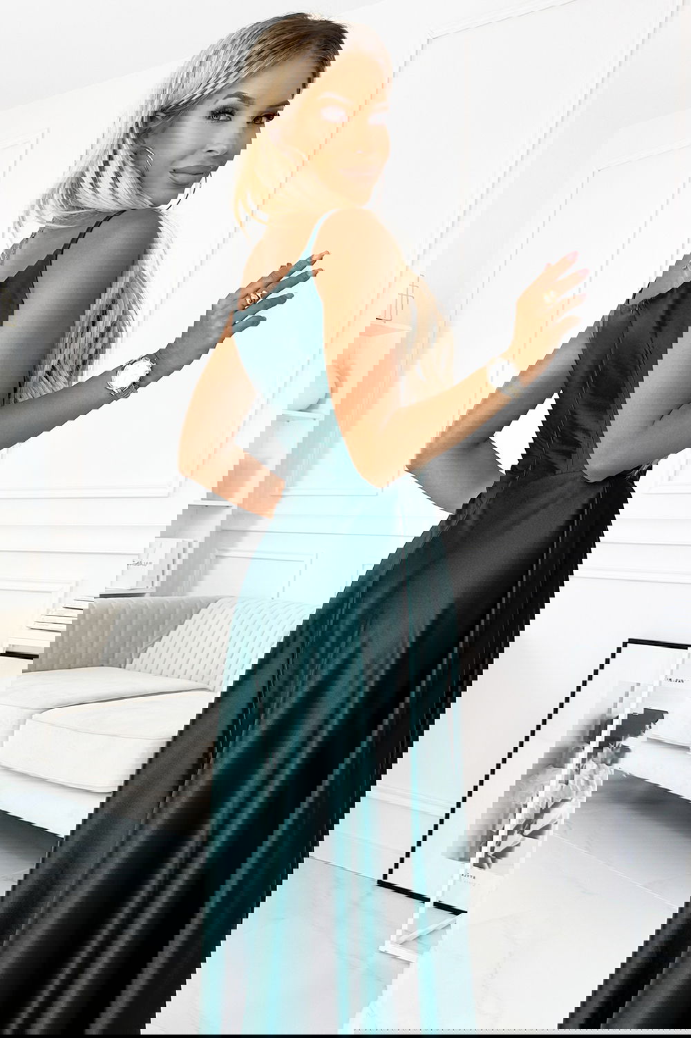 Chiara - elegancka maxi długa satynowa suknia na ramiączkach. Pięknie wyprofilowany dekolt i rozcięcie na spódnicy tworzy niecodzienną kompozycję. Uszyta z połyskującej, gładkiej, lekko elastycznej satyny w kolorze zielonym. Sukienka idealna na wesela, sylwestra, studniówkę, karnawał i inne ważniejsze wyjścia. Produkcja polska. Marka Numoco.