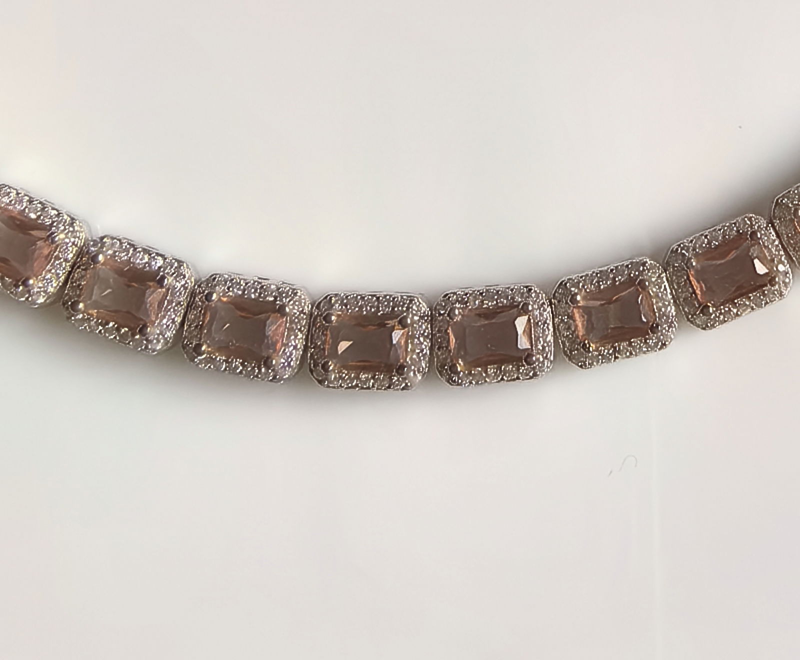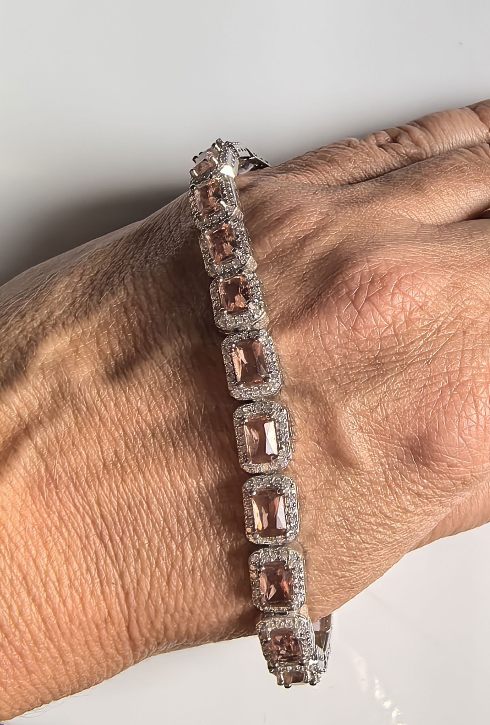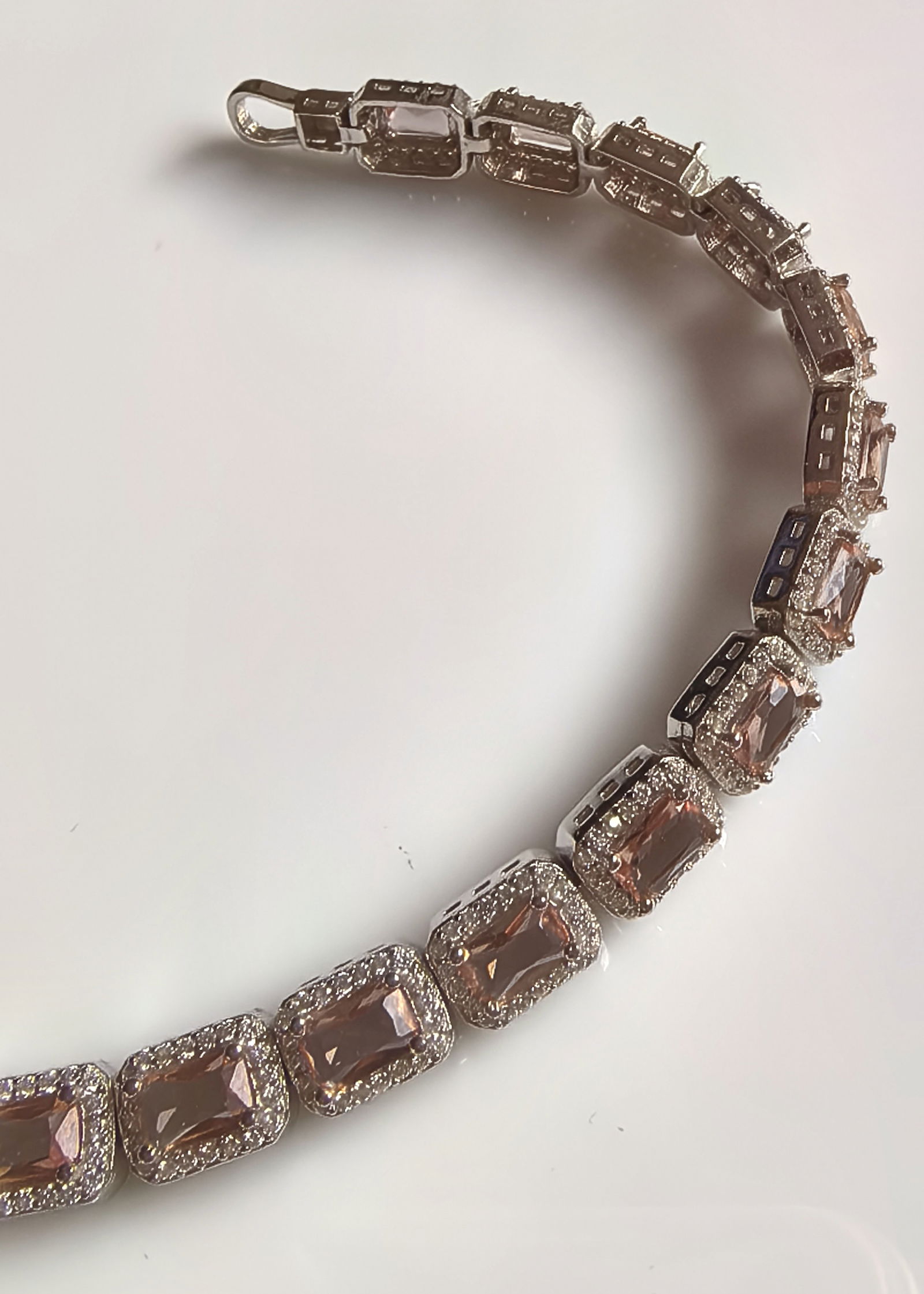 każde prostokątne ogniwo zawiera centralny kamień o subtelnym, różowo-beżowym odcieniu, który w zależności od światła zmienia barwę od oliwkowej zieleni po malinowy róż
