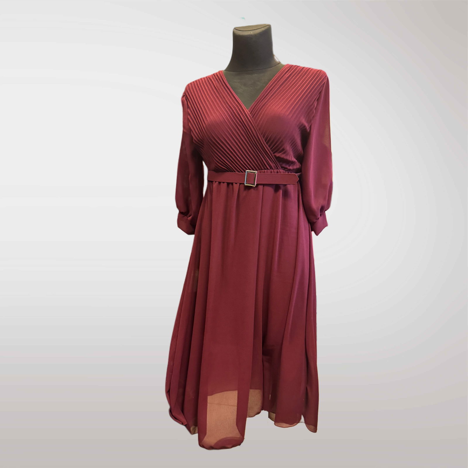 Elegancka Sukienka z Paskiem i Plisowaną Górą - Bordo