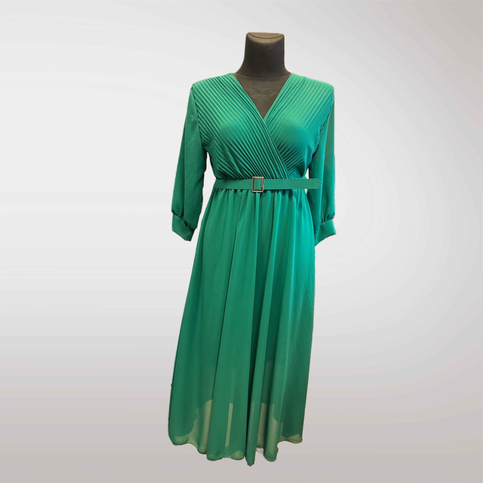Szykowna sukienka o długości midi z dekoltem kopertowym i plisowaną górą. Rękawy 3/4 oraz pasek w talii pięknie podkreślają sylwetkę. Dół wykonany z lekkiego, półprzezroczystego materiału, który dodaje lekkości i klasy, ma podszewkę. Idealna na uroczystości, do pracy lub na kolację.