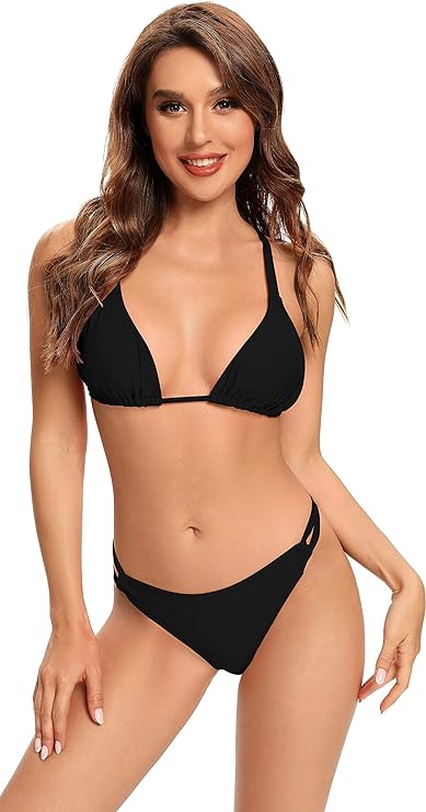 Zaprezentuj się w pełnej elegancji z czarnym bikini SHEKINI. Ten dwuczęściowy strój kąpielowy z halterem i regulowanym trójkątnym topem to kwintesencja stylu i wygody.