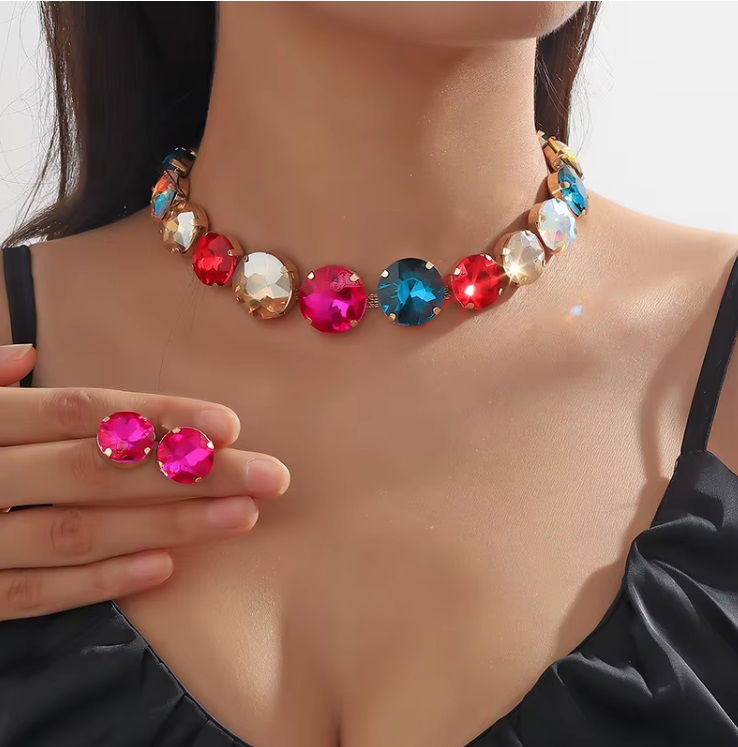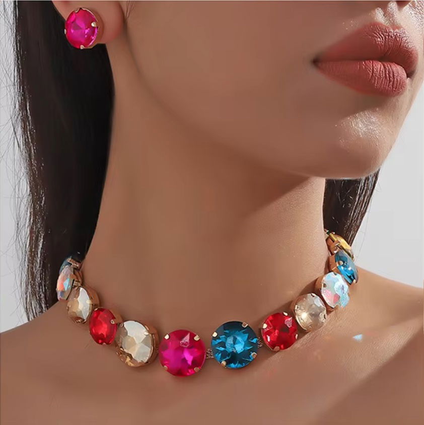 Elegancki komplet biżuterii kolczyki i kolia w intensywnych kolorowych odcieniach to doskonały wybór na wyjątkowe okazje. Delikatnie połyskujące kamienie sprawiają, że biżuteria przyciąga wzrok, nadając każdej stylizacji wyjątkowego charakteru. Ten zestaw będzie idealnym uzupełnieniem wieczorowej sukni, podkreślając szykowność i styl.