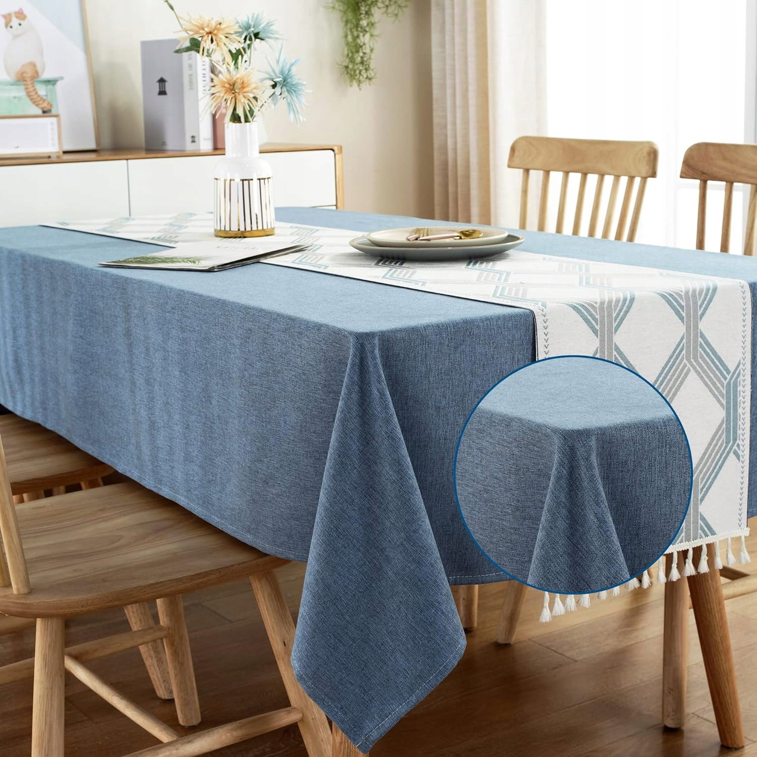 ComfortAce Coriander Zestaw obrus 180 x 135 cm + bieżnik na stół, prostokątny, nadaje się do prania, dekoracja stołu, odporny na wysoką temperaturę, do domu, na zewnątrz,(niebieski i biały).