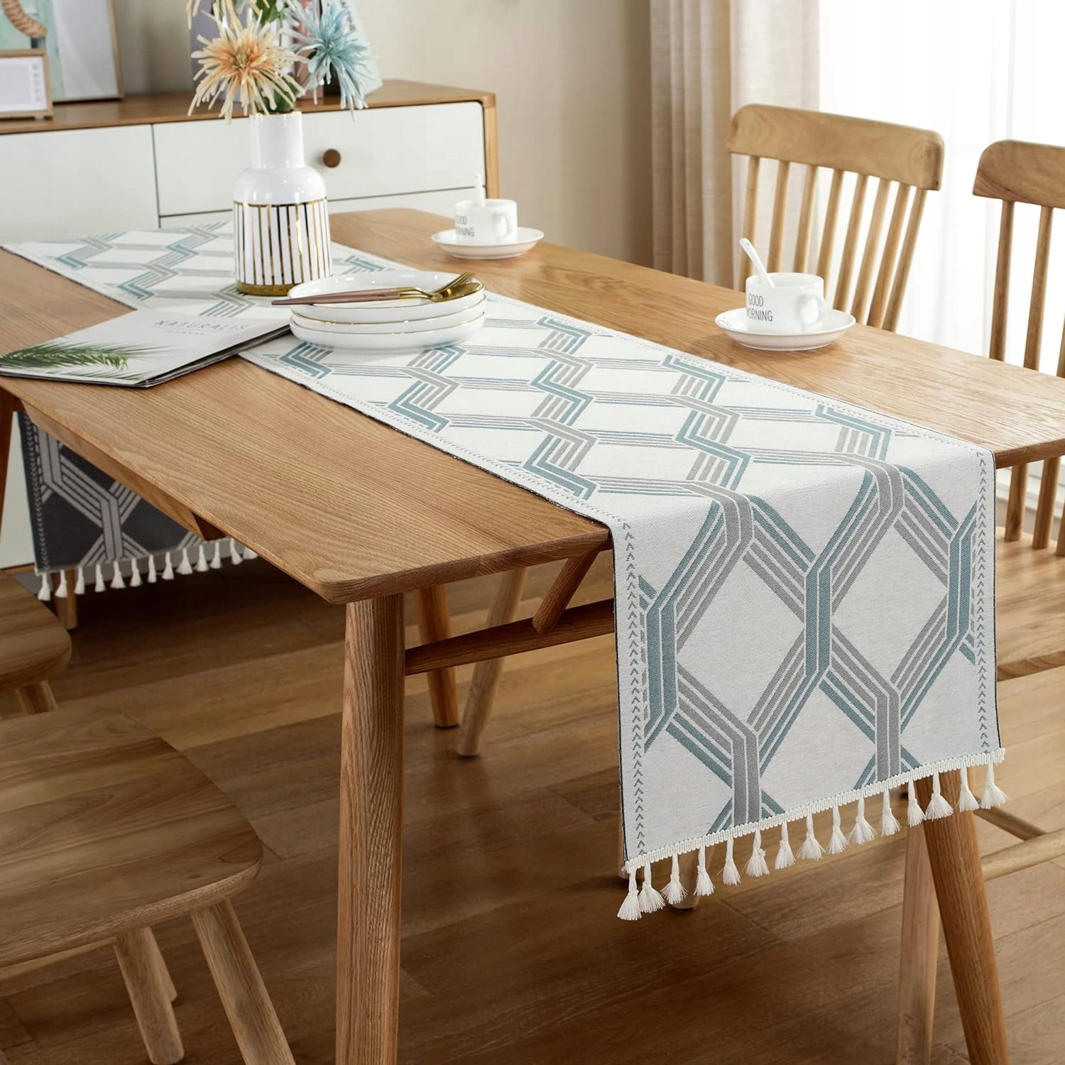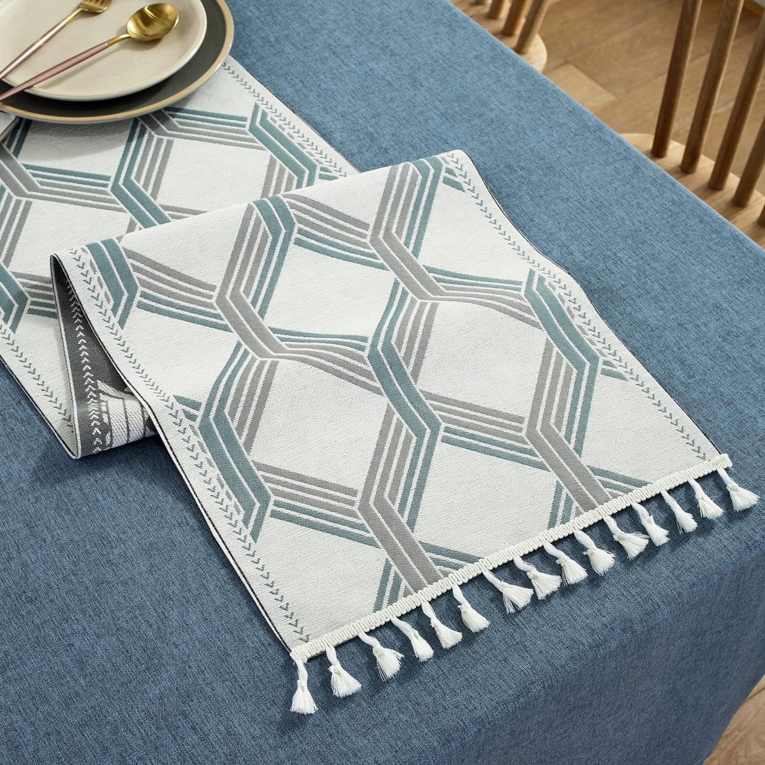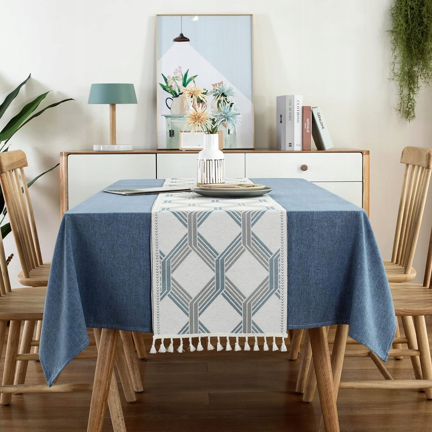 - Stylowa klasyka: elegancki niebieski obrus, zdobiony białym, ręcznie tkanym bieżnikiem w delikatny wzór żakardowy. Subtelnie frędzlowany obrus dodaje uroku, doskonale prezentując się zarówno w formalnych, jak i bardziej swobodnych aranżacjach wnętrz.