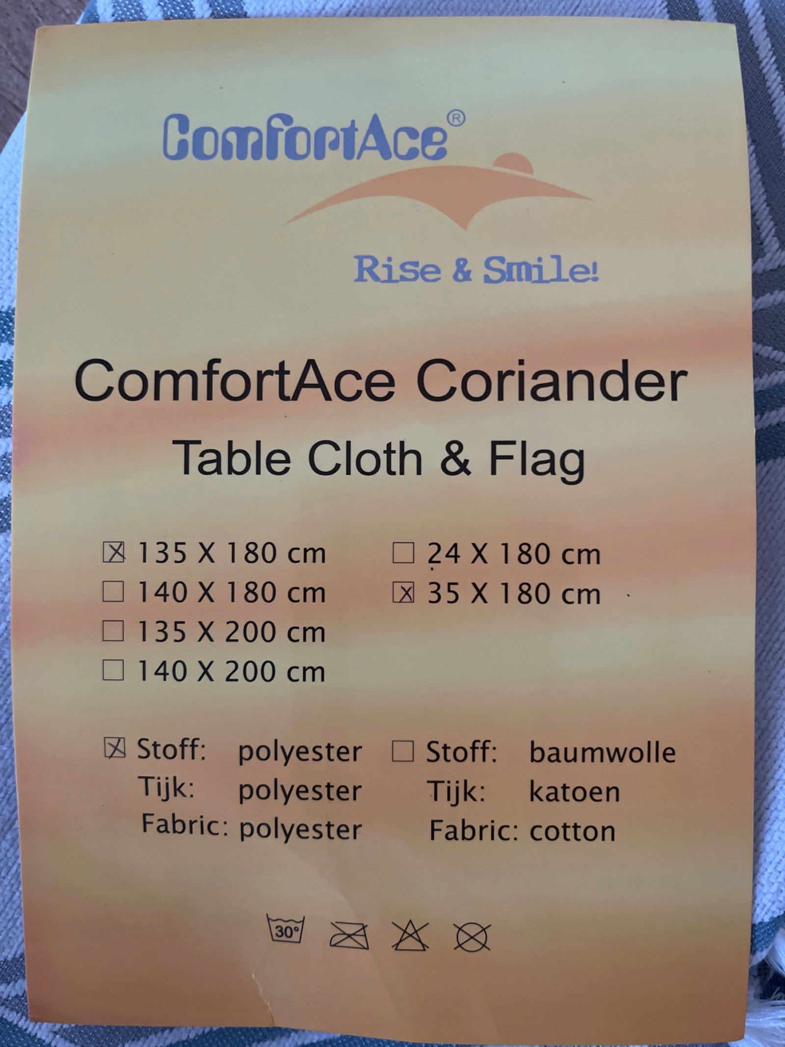 - Łatwa pielęgnacja: obrus jest pyłoszczelny, nie gniecie się. Można go prać ręcznie lub w pralce, nie wybielać, suszyć w suszarce bębnowej lub rozłożyć na płasko do wyschnięcia. Nie wymaga prasowania.