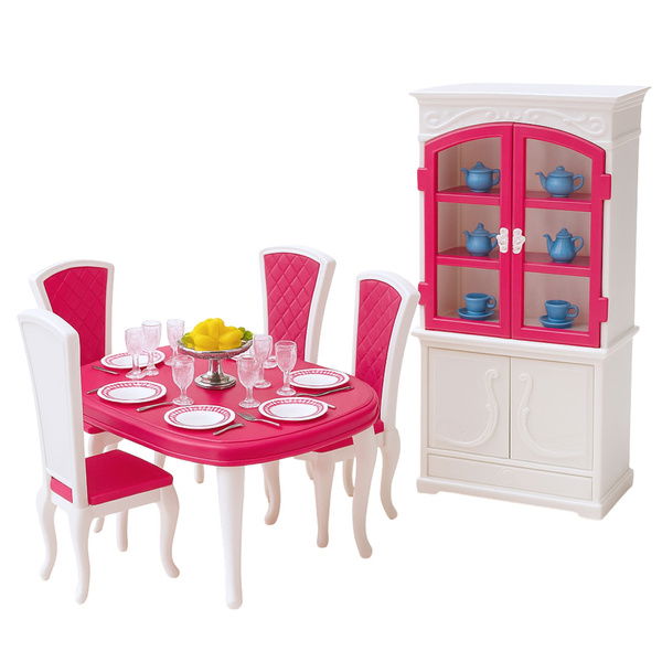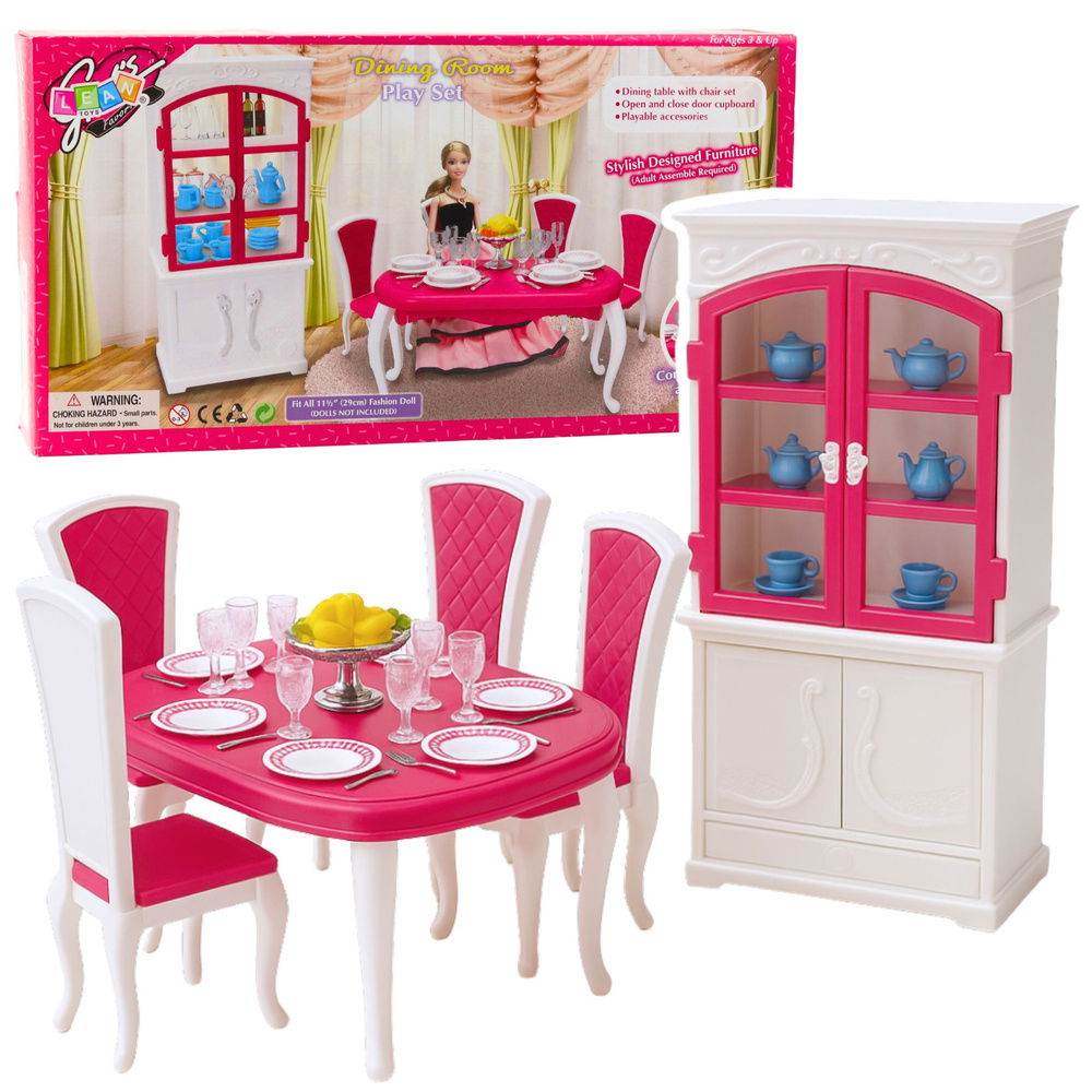 Składa się z dużego stołu, krzeseł, kredensu oraz bogatego zestawu naczyń i dekoracji, które umożliwiają tworzenie realistycznych scenek związanych z przygotowywaniem posiłków i organizowaniem kolacji. Kredens z otwieranymi drzwiami pomieści talerzyki, kubki, dzbanki i inne elementy zastawy. Solidne wykonanie z trwałego tworzywa sztucznego zapewnia stabilność i atrakcyjny wygląd. Produkt spełnia normy bezpieczeństwa CE i EN71, co gwarantuje bezpieczną zabawę. Zestaw doskonale uzupełnia domki dla lalek oraz rozwija kreatywność, umiejętności społeczne i wyobraźnię dzieci. To idealny sposób na rozwijanie zdolności najmłodszych i zapewnienie im pełnej gamy kreatywnej zabawy.