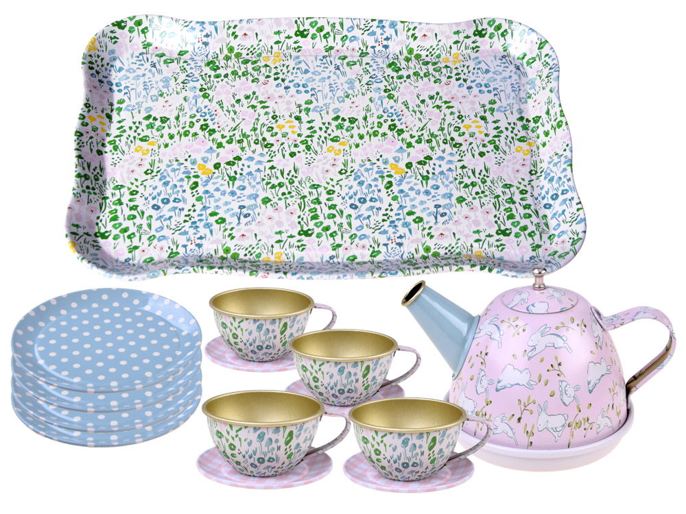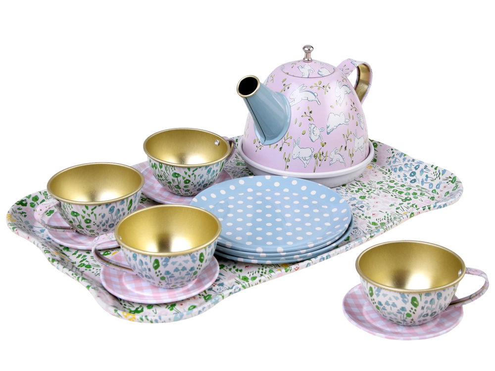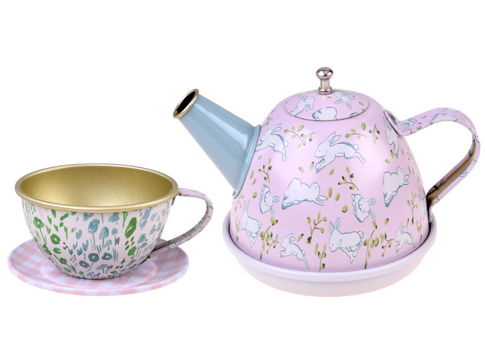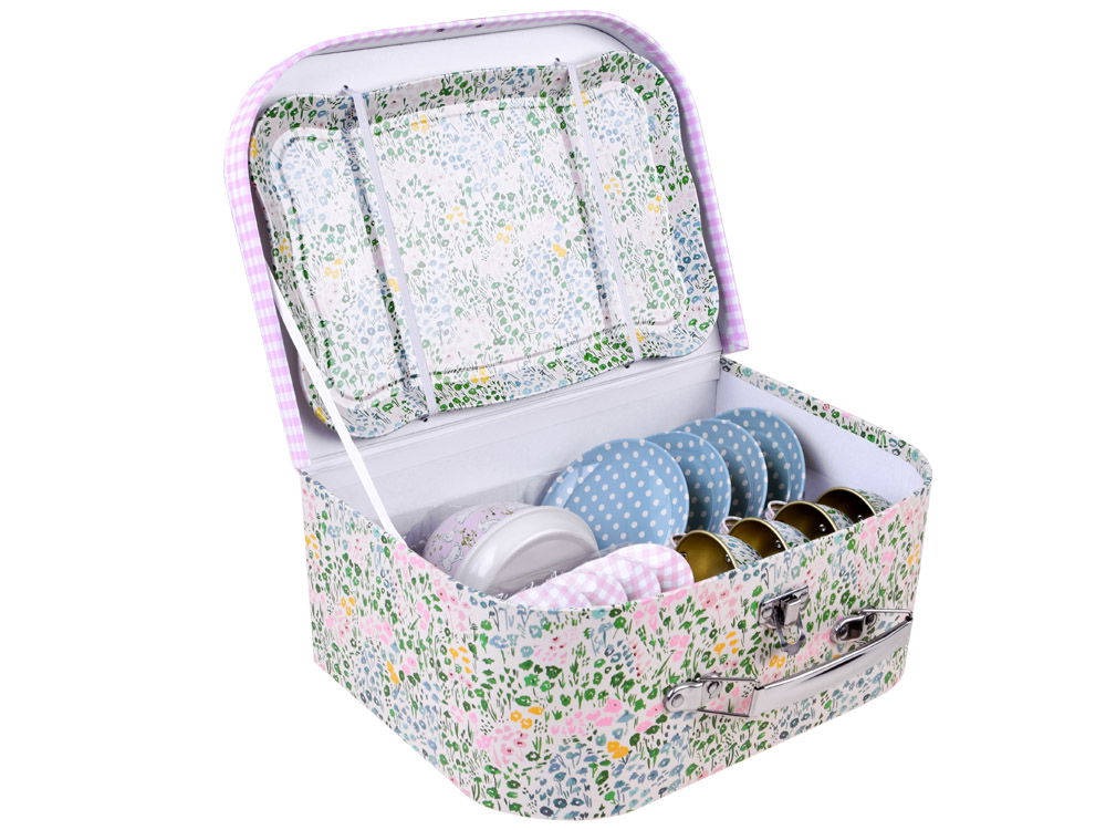 Odkryj magiczny świat zabawy z zachwycającym zestawem herbacianym dla dzieci! Metalowy serwis śniadaniowo-kawowy wraz z tacą, czajnikiem, talerzami, spodkami i filiżankami przeniesie maluchy do kawiarni i restauracji pełnych wyobraźni. Uroczy kuferek z grafiką łąkowo-kraciastą sprawdzi się doskonale na pikniku lub w parku. Doskonały prezent, który rozwija umiejętności kulinarno-organizacyjne i pobudza fantazję dzieci. Zestaw herbaciany, który zapewni wiele radości i edukacyjnej zabawy!