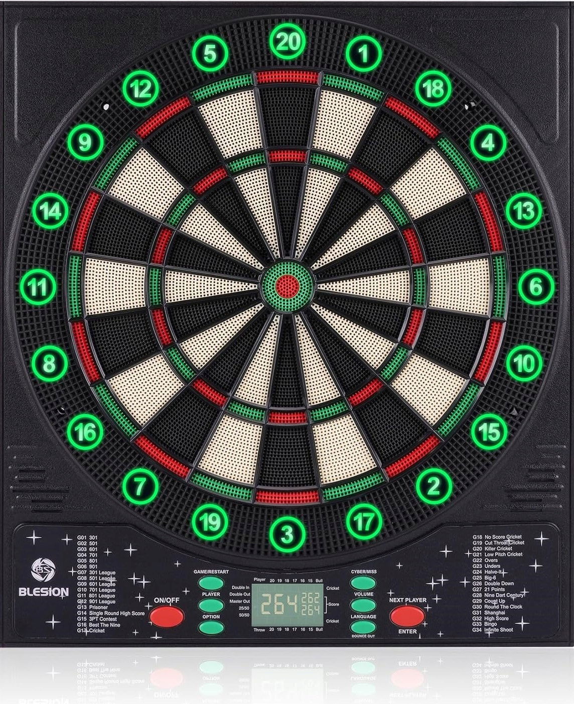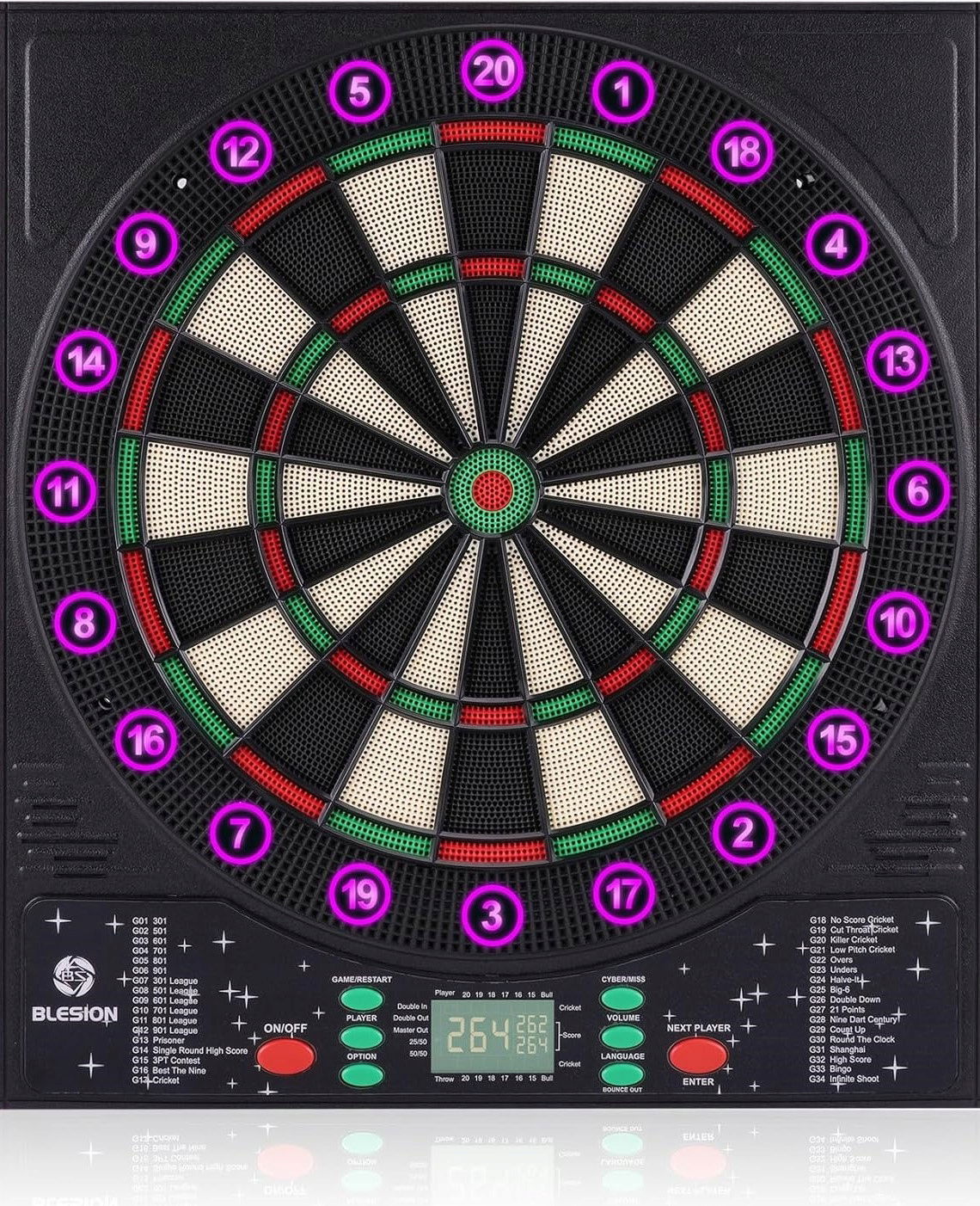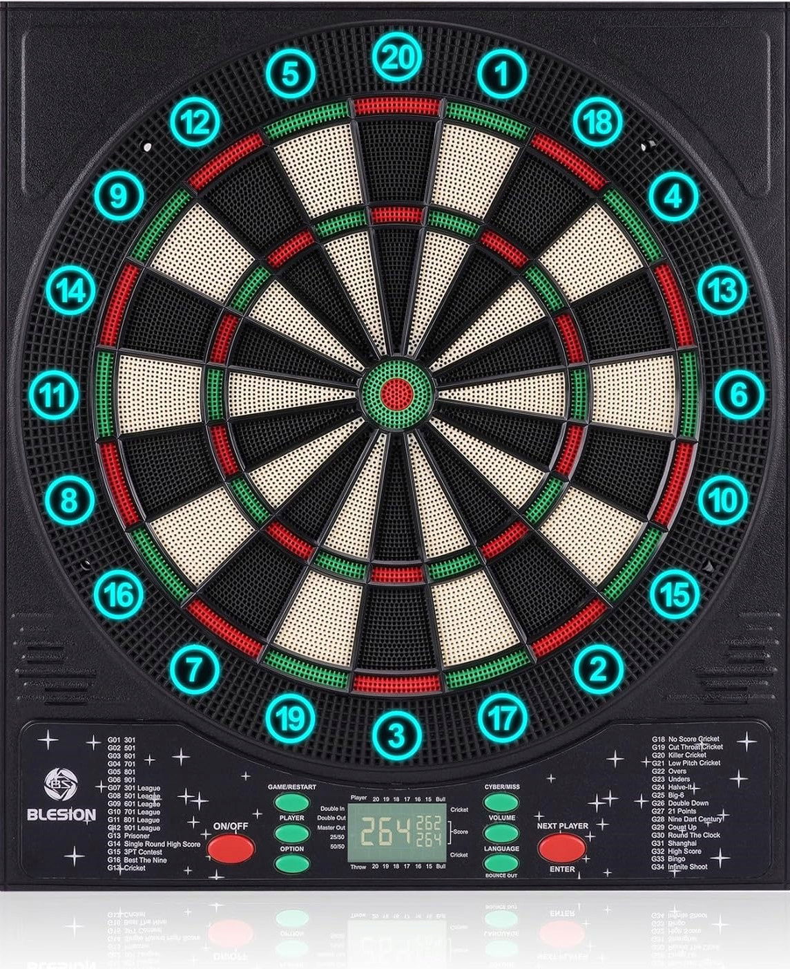 Szukasz nowoczesnej tarczy do darta, która urozmaici Twoją rozgrywkę? Blesion Elektroniczna Tarcza do Darta 2024 to zaawansowany model, który łączy świetną jakość wykonania, nowoczesny design i rozbudowane funkcje gry. Wyposażona w podświetlany pierścień liczbowy, niemiecki system głosowy oraz elektroniczny licznik punktów, zapewnia dynamiczną i profesjonalną zabawę dla maksymalnie 8 graczy.
