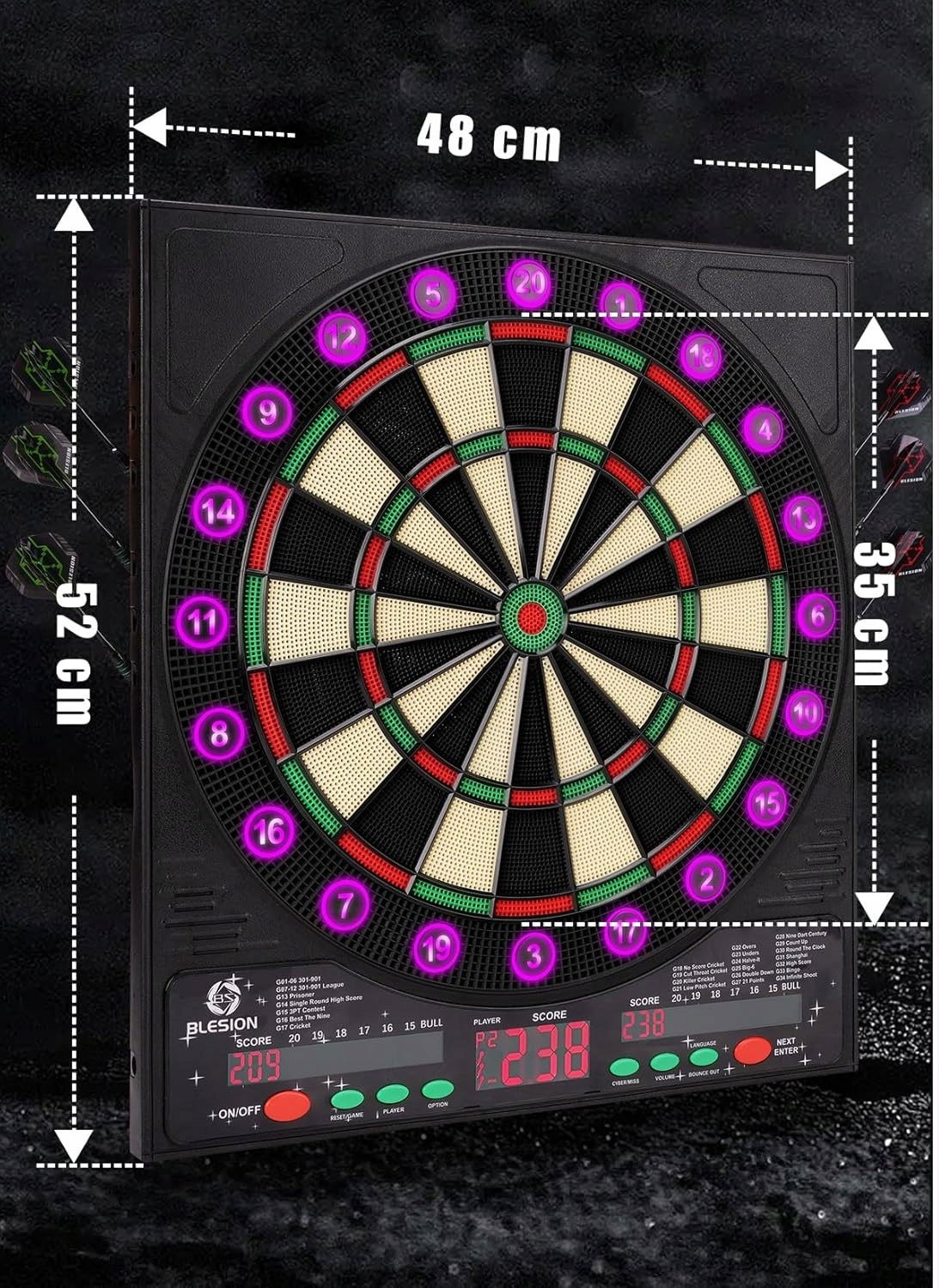 Szukasz nowoczesnej i trwałej tarczy do darta? BLESION Elektroniczna Tarcza do Darta 2024 to doskonały wybór dla każdego miłośnika tej gry! Wyposażona w podświetlany pierścień cyfrowy, regulowaną głośność oraz 34 gry z 355 wariantami – zapewni mnóstwo emocji zarówno początkującym, jak i doświadczonym graczom. Dzięki solidnej konstrukcji i dołączonym akcesoriom, ta tarcza to idealny wybór na rozgrywki w domu, klubie czy biurze!
