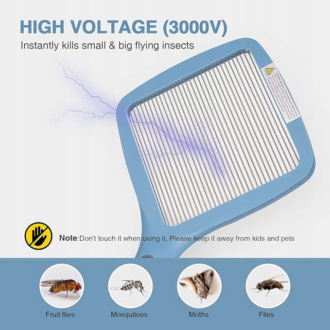 Elektryczna rakieta została zaprojektowana z pojedynczą warstwą zabijającą muchy i wysokim napięciem (3000 V), może zabić większość małych latających owadów natychmiast! Gdy mucha, osa, komary lub owad dotknie warstwy, zostanie natychmiast porażony prądem. UWAGA: Nie dotykaj warstwy, gdy działa lub się ładuje. Trzymaj ją z dala od dzieci i zwierząt domowych. Świetny pomocnik do ochrony Ciebie i Twojej rodziny przed muchami i irytującymi owadami.