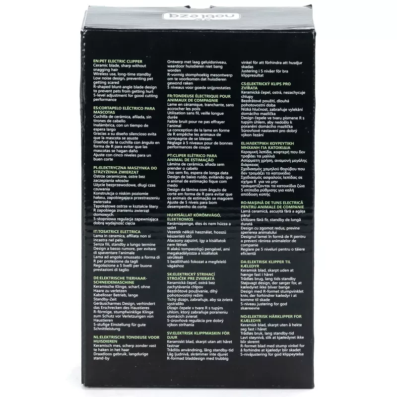 Konstrukcja redukująca hałas eliminuje strach zwierząt domowych. Wyposażona w cztery specjalne grzebienie graniczne, łatwa w użyciu. Wysokiej jakości materiały, trwałe