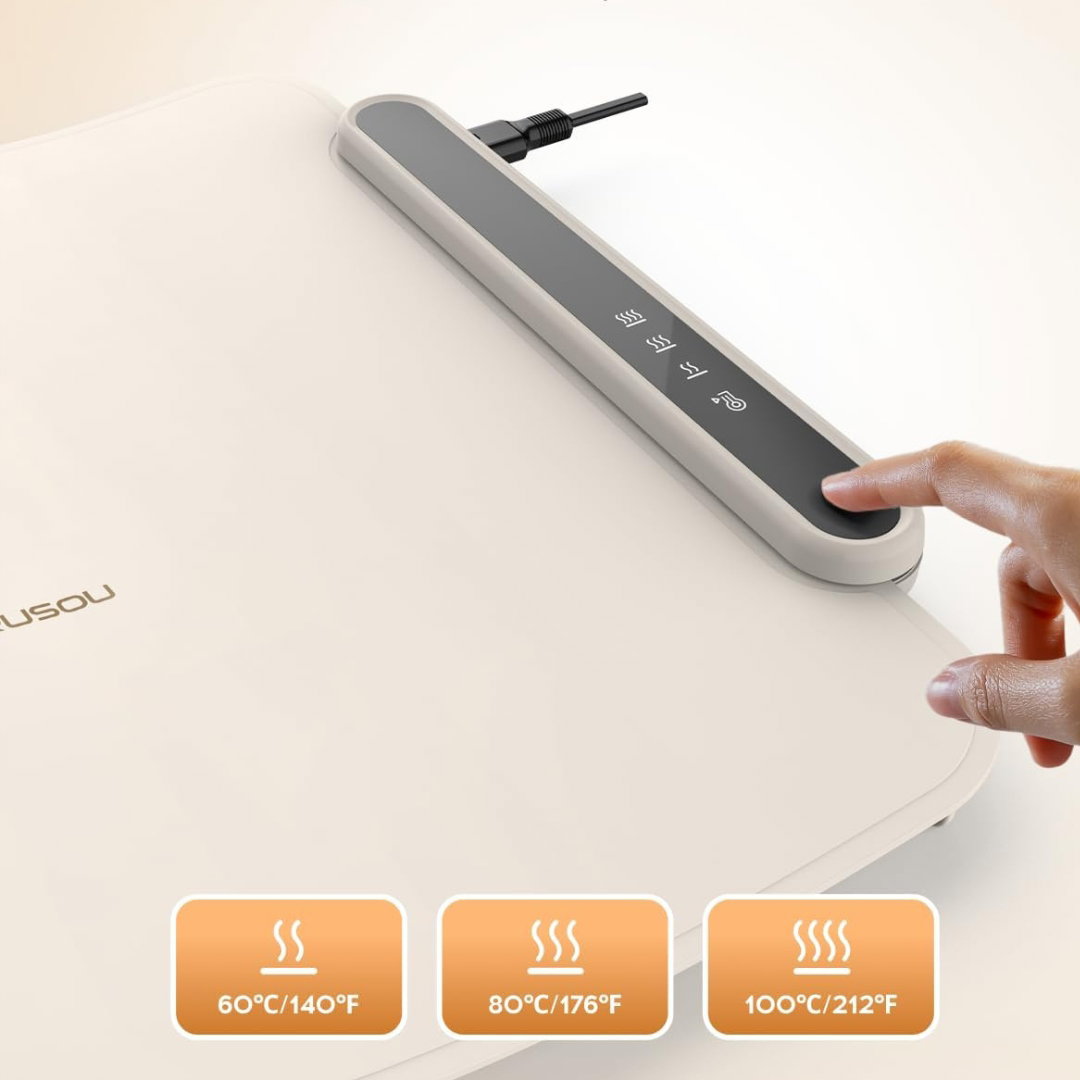- Trzystopniowa regulacja temperatury: dzięki możliwości błyskawicznego nagrzania w zaledwie 10 sekund podgrzewacz utrzymuje potrawy w idealnej temperaturze. Trzy poziomy grzania – 60°C, 80°C i 100°C – pozwalają zachować ciepło i świeżość potraw przez dłuższy czas, podnosząc komfort i jakość posiłków.