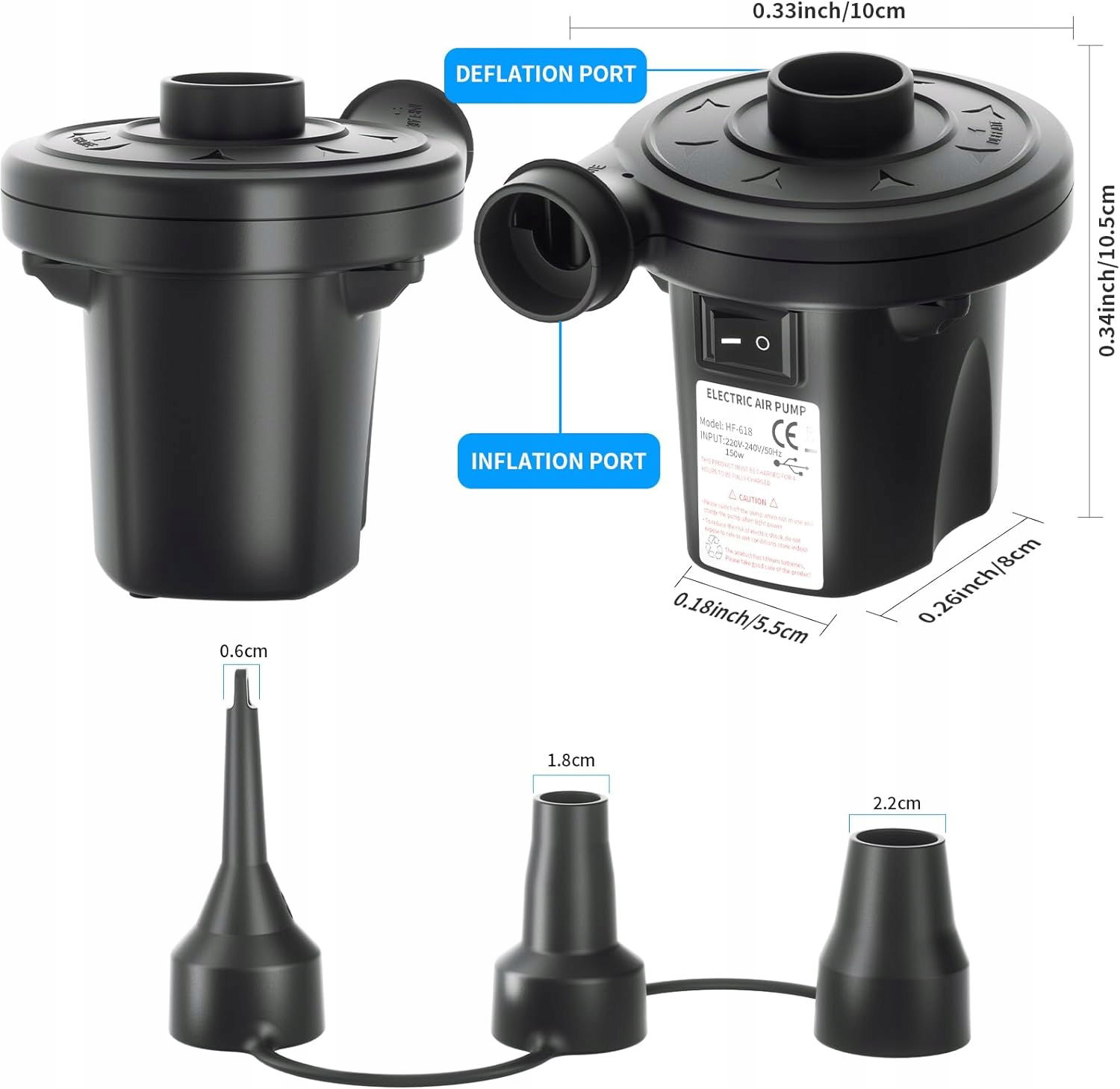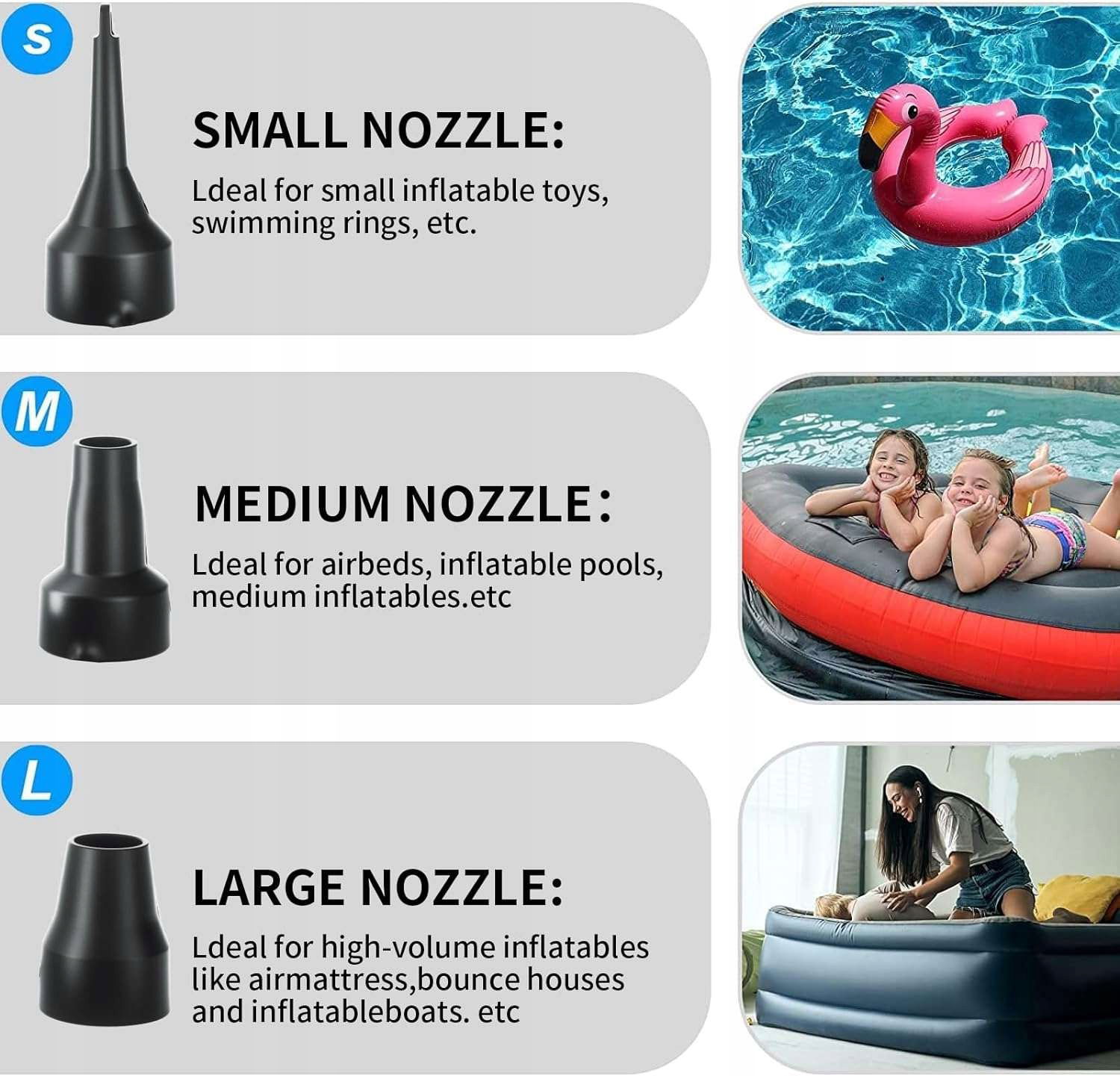 ✅ Wiele dysz: W zestawie znajdują się trzy dysze o różnych rozmiarach, które są odpowiednie dla różnych portów inflacyjnych i deflacyjnych. Dzięki nim pompa może być używana do napompowania i opróżniania różnych przedmiotów, takich jak pontony, pierścienie pływackie, sportowe wyposażenie kempingowe, baseny i zabawki dla dzieci.