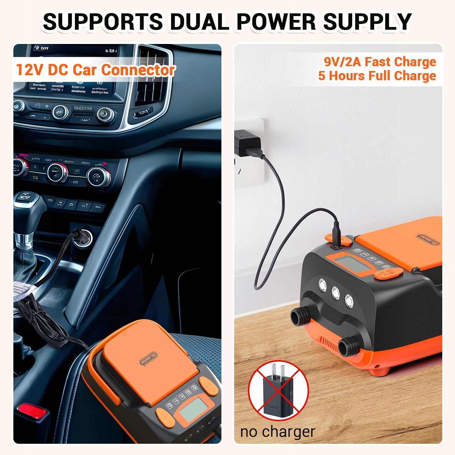 3 możliwości ładowania: Więcej możliwości, więcej powietrza! Wybierz jedną z trzech opcji zasilania tej pompy elektrycznej SUP.