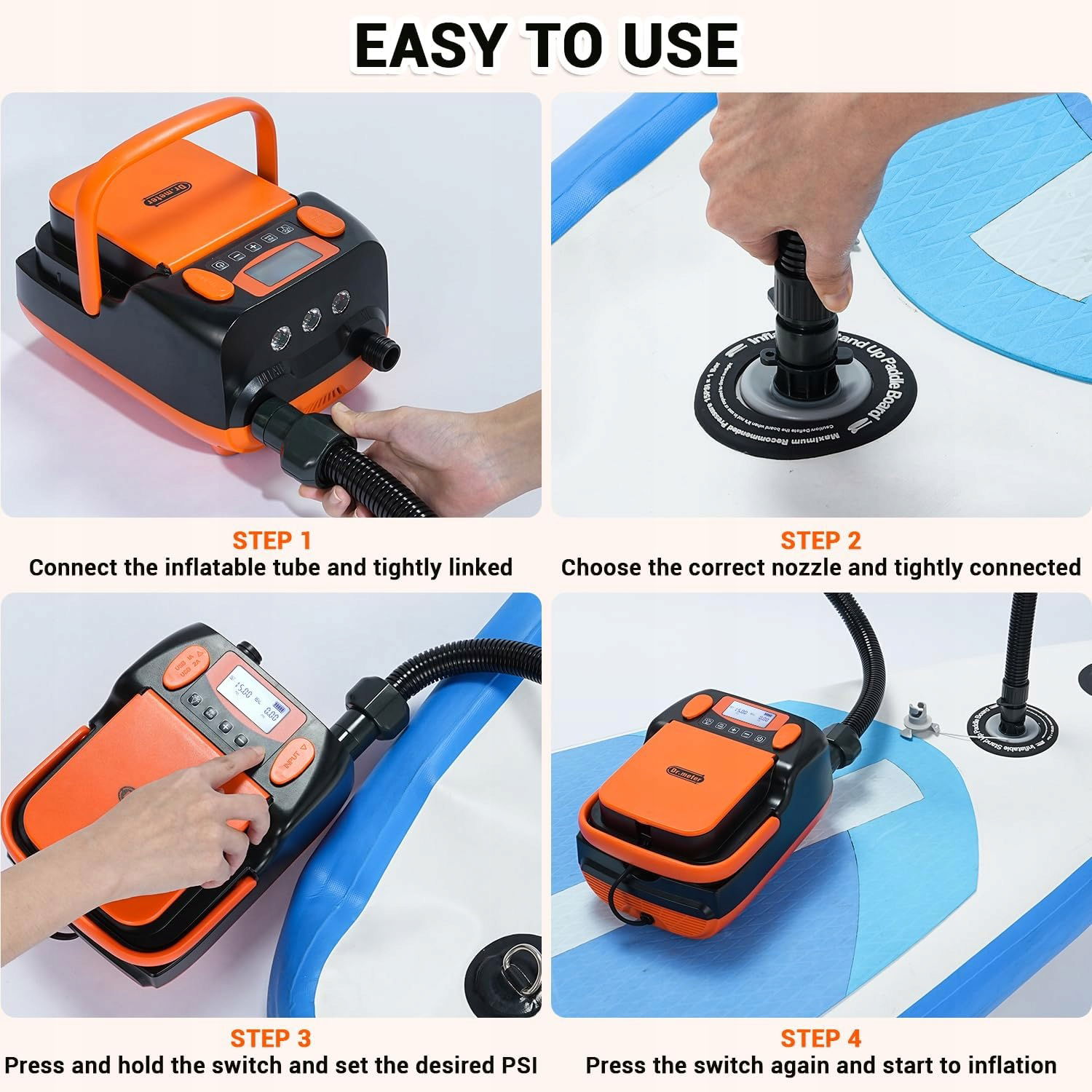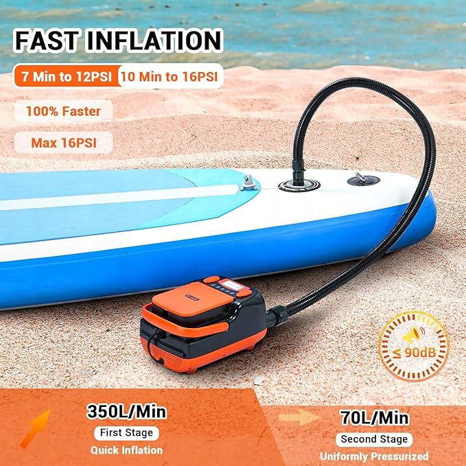 Duży zakres zastosowania: Ta uniwersalna elektryczna pompa sup o maksymalnym ciśnieniu 16 psi może być używana do wioseł stojących, pontonów i wielu innych. Dzięki dwóm trybom pompowania można najpierw napompować z prędkością 600 l na min dla maksymalnego dopływu powietrza, a na koniec z niższym dopływem powietrza 70 l na min napompować resztę do idealnego stanu.