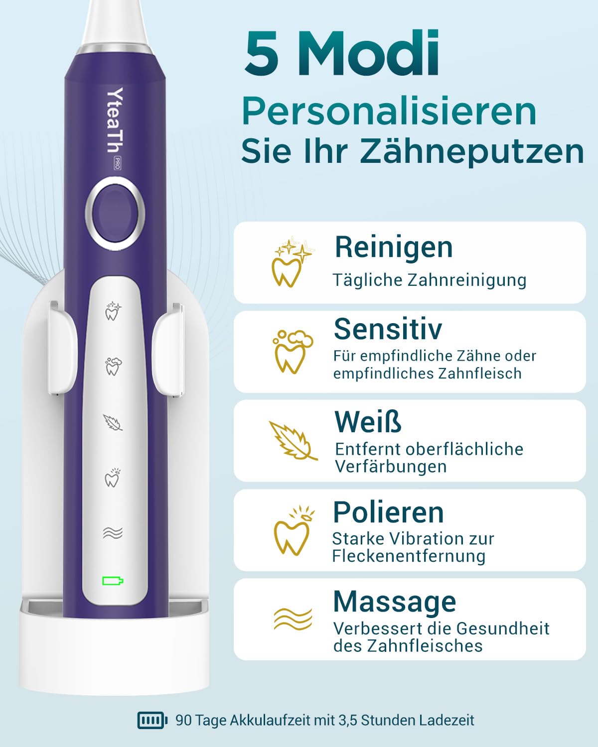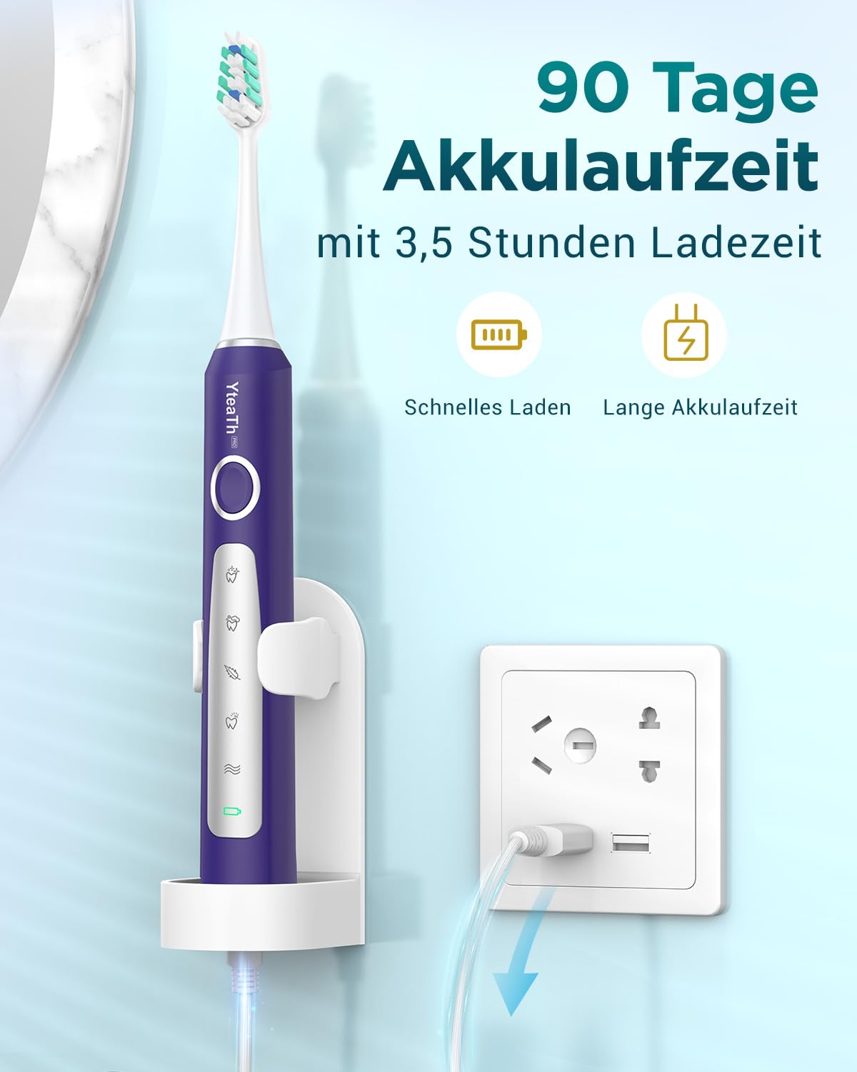 Długa żywotność baterii – 90 dni – zapewnia bezstresowe podróże: Po zaledwie 3,5 godzinie ładowania szczoteczka może być używana nawet przez 90 dni. Wystarczy ładować ją cztery razy w roku. Elektryczna szczoteczka do zębów YTEATH PRO idealnie nadaje się do codziennego użytku i dłuższych podróży.