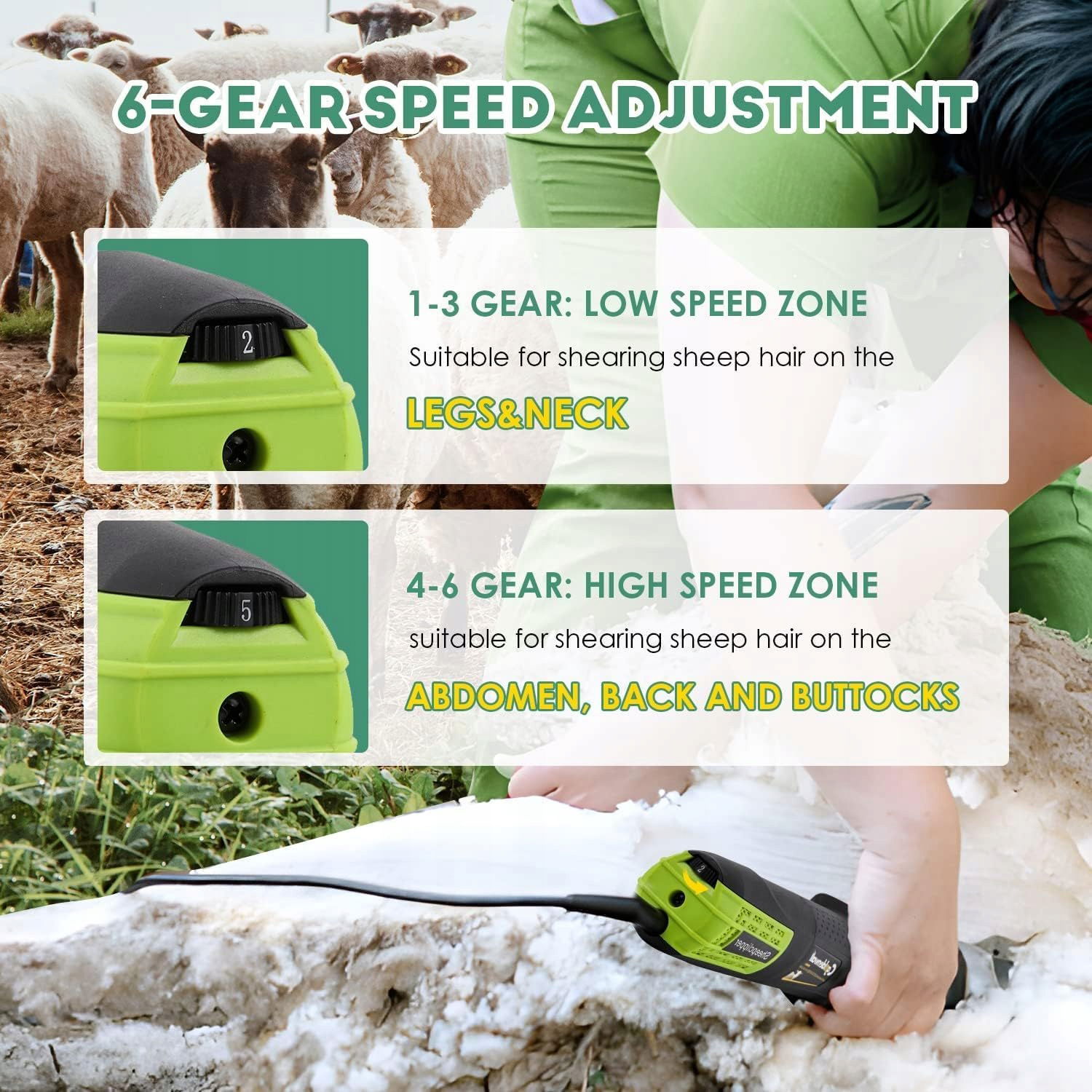 ✔️ Pełna kontrola dzięki 6-stopniowej regulacji prędkości: Dopasuj prędkość strzyżenia do każdej części ciała owcy! Dzięki sześciu biegom możesz łatwo regulować prędkość w zależności od obszaru – od delikatnych partii, takich jak szyja i nogi, po większe powierzchnie, jak plecy i brzuch. Strzyżenie staje się precyzyjne i komfortowe!