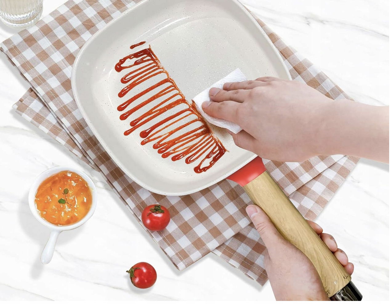 Wnętrze elektrycznej patelni jest wykonane ze stopu aluminium z powłoką nieprzywierającą, nie zawiera PFOA, zapobiega przywieraniu potraw i jest łatwa do czyszczenia.