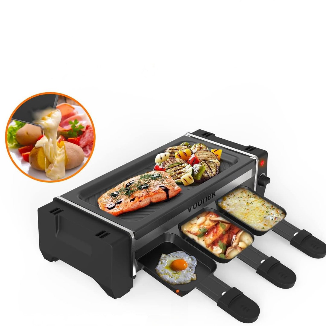 Raclette 2-osobowy grill do raclette, mini raclette, 3 patelnie, 3 szpatułki, drewniana szpatułka, grill stołowy, elektryczny grill koreański, grill elektryczny, nieprzywierająca płyta grillowa, 700 W.