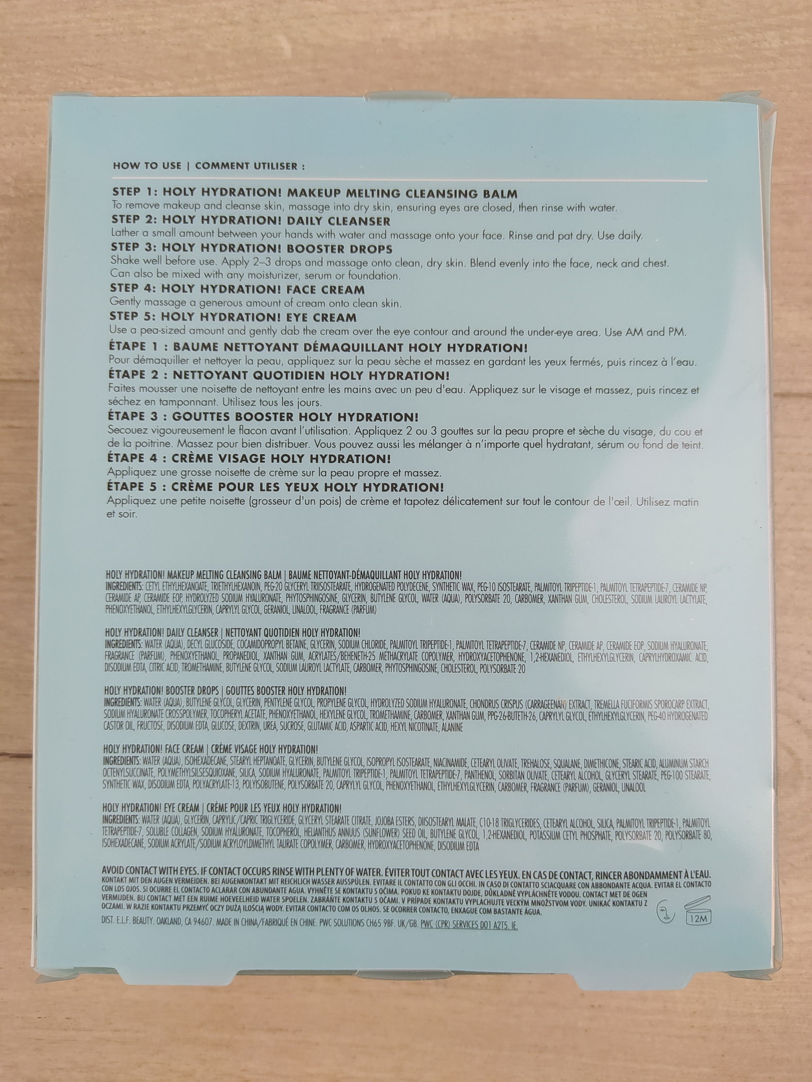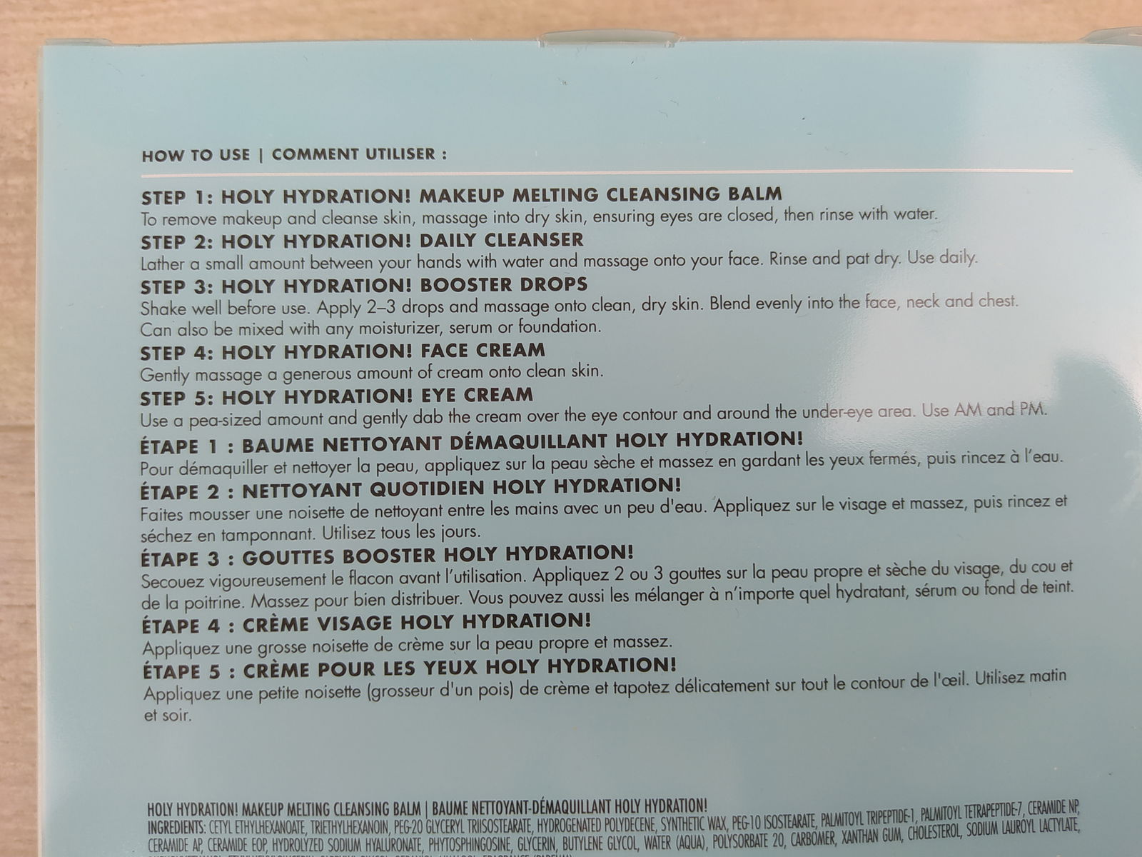1. Nałóż Holy Hydration Daily Cleanser na wilgotną skórę, wmasuj i spłucz. 2. Użyj Holy Hydration Makeup Melting Cleansing Balm do demakijażu. 3. Nałóż Hydrating Booster Drops na twarz i szyję. 4. Nałóż Holy Hydration Face Cream na twarz i szyję. 5. Nałóż Holy Hydration Eye Cream na okolice oczu.
