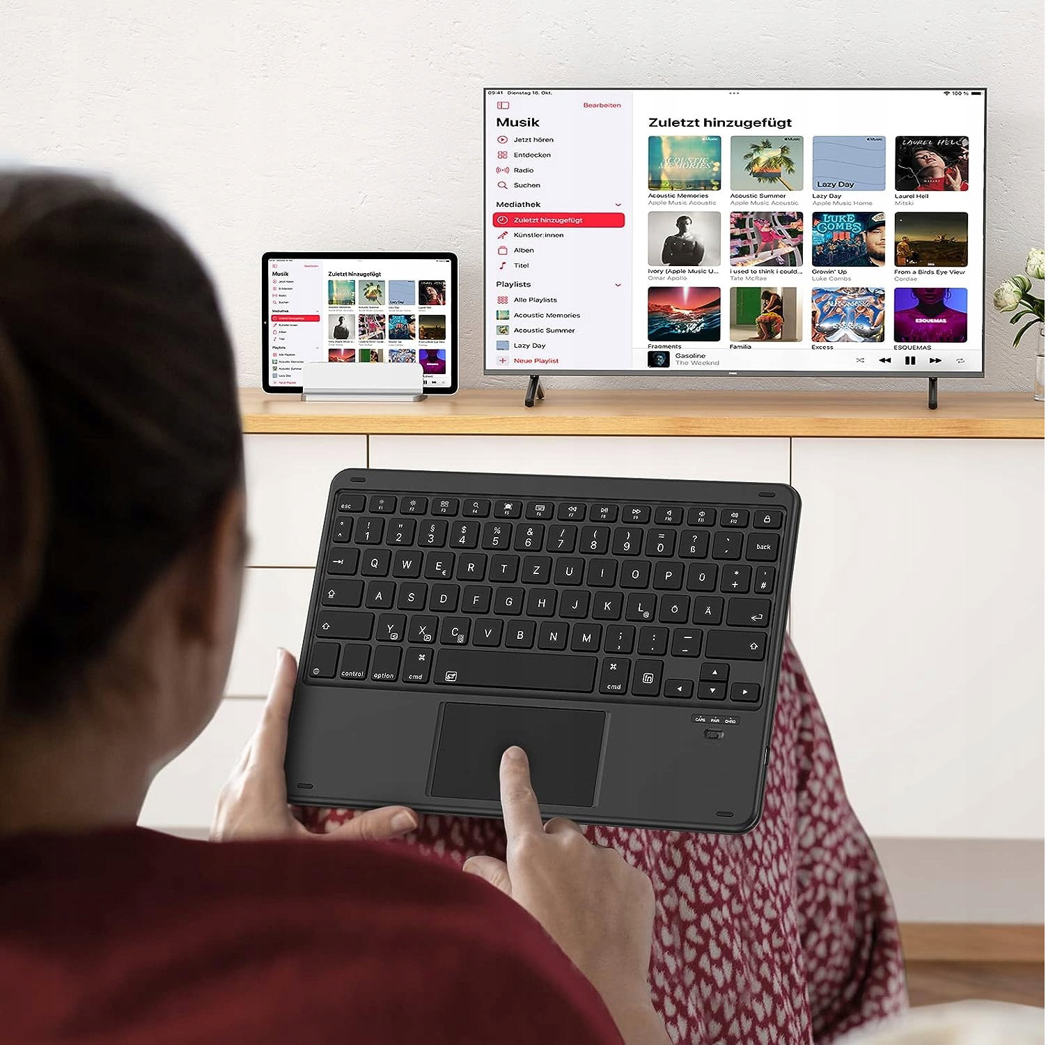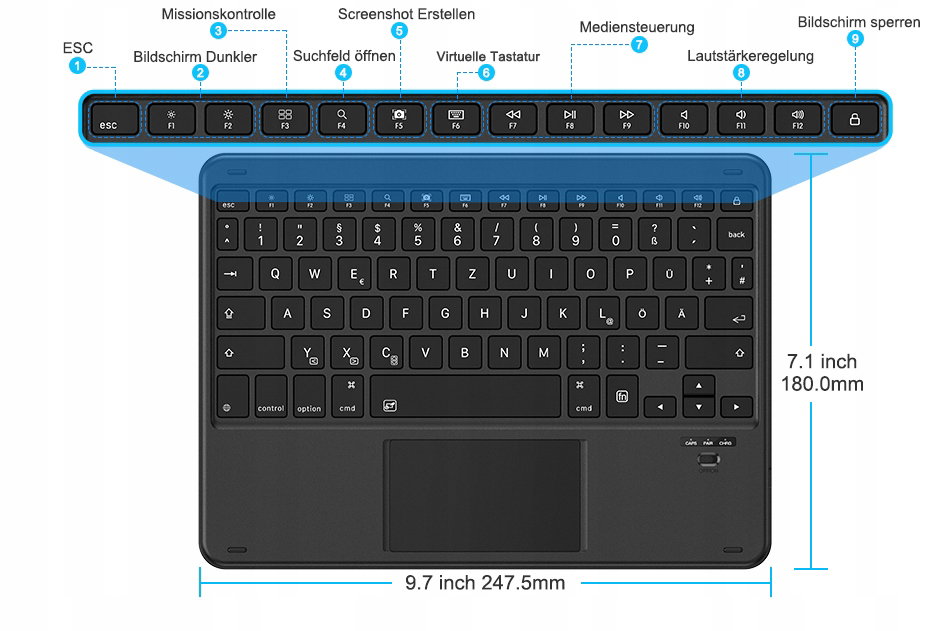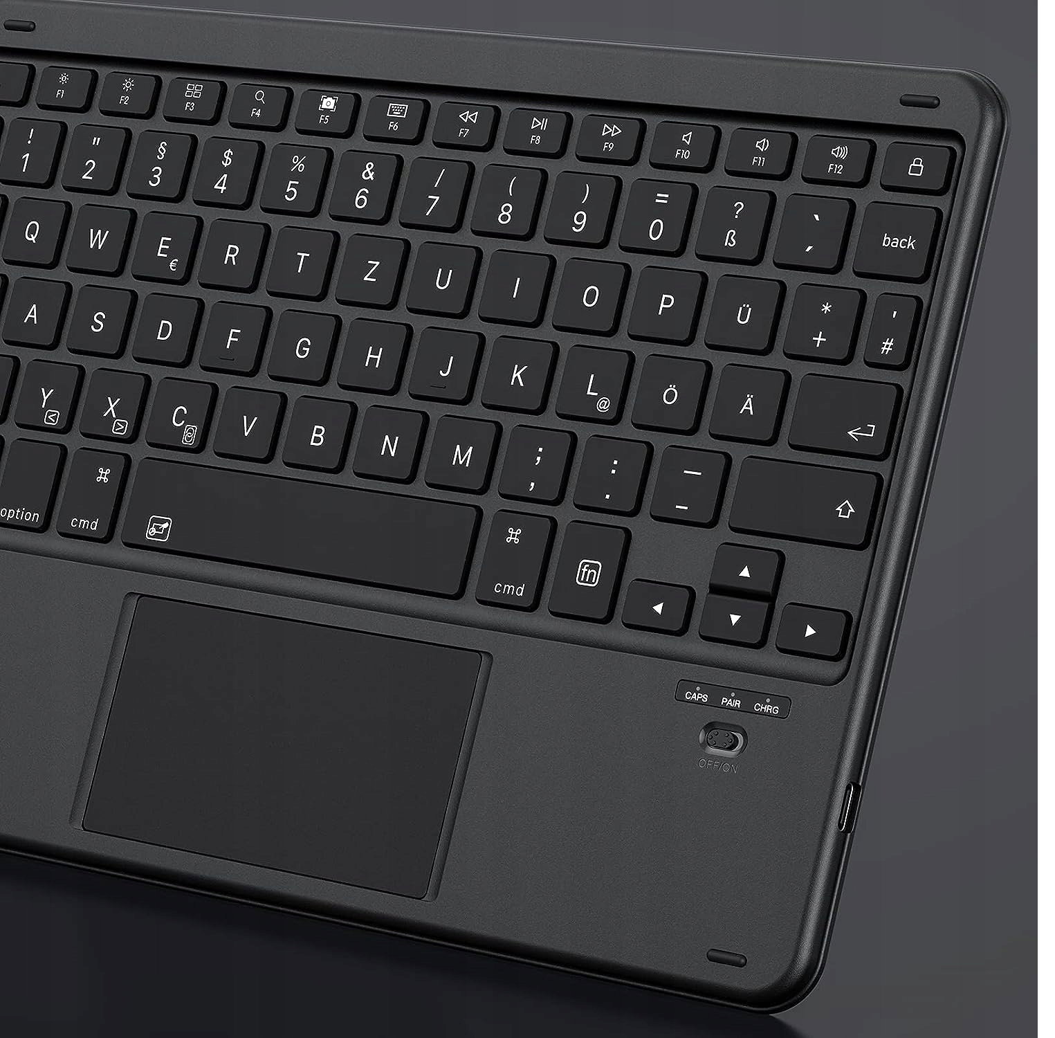 Bezprzewodowa klawiatura Bluetooth Emetok do iPada, niemiecka klawiatura QWERTZ z gładzikiem [14 funkcyjnych] do iPada z systemem iPad OS 14.5 lub nowszym