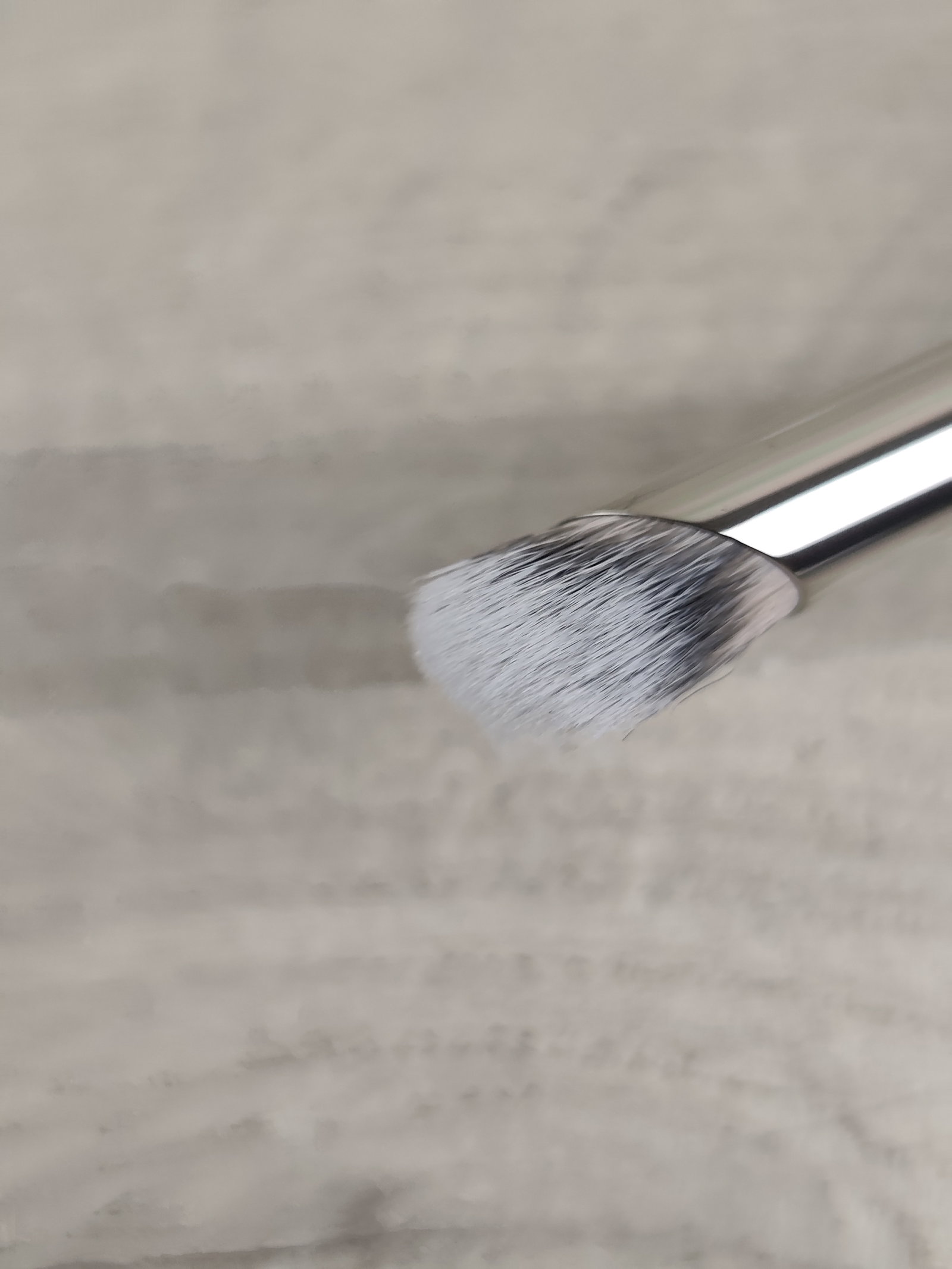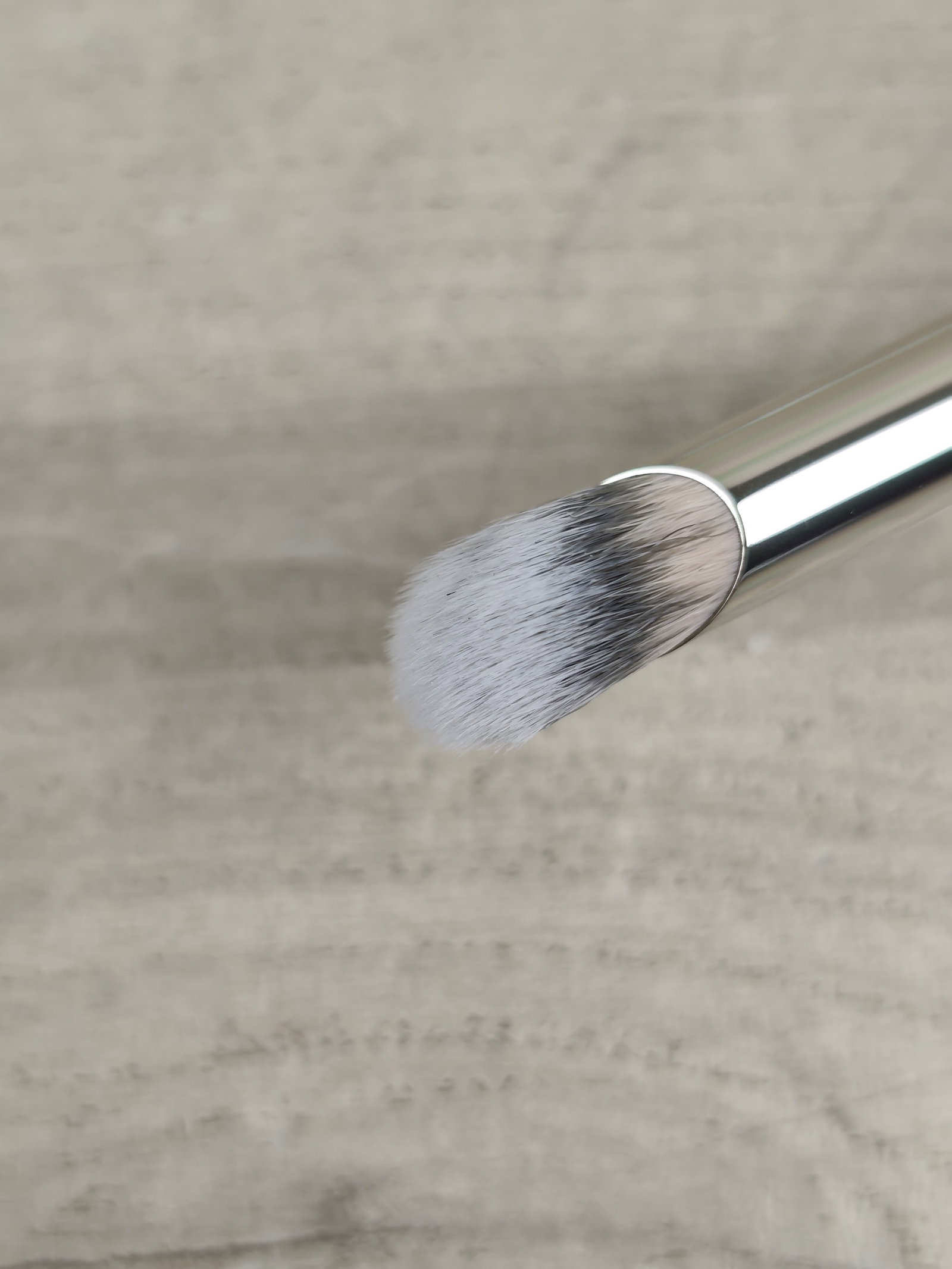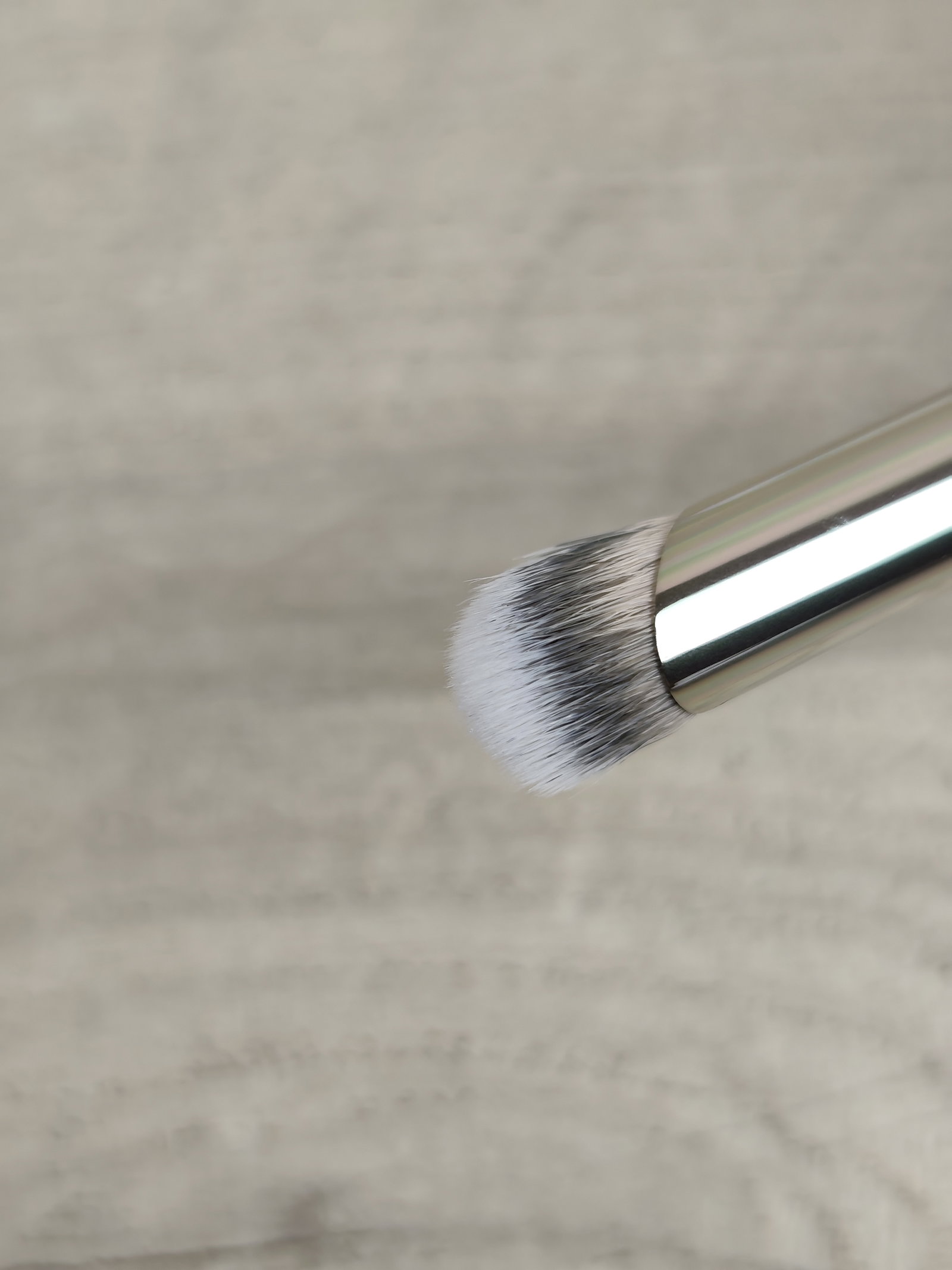 Dzięki gęstemu, miękkiemu włosiu syntetycznemu równomiernie rozprowadza produkt, nie pozostawia smug i pozwala uzyskać naturalne wykończenie. Skośny kształt ułatwia dotarcie do załamań skóry, a kompaktowy rozmiar sprawia, że pędzel świetnie sprawdza się w makijażu codziennym i precyzyjnym.