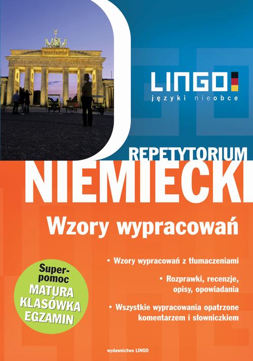 Seria repetytoriów językowych Wydawnictwa Lingo przeznaczona jest dla wszystkich uczących się języka niemieckiego, a zwłaszcza uczniów, studentów, maturzystów i osób przygotowujących się do egzaminów językowych. Repetytorium "Niemiecki. Wzory wypracowań" pozwala opanować najważniejsze formy wypowiedzi wymagane przez nauczycieli czy egzaminatorów, takie jak: rozprawki, recenzje, opisy i opowiadania. Repetytorium "Niemiecki. Wzory wypracowań" to: • super pomoc do matury, egzaminu, klasówki, • 60 gotowych prac pisemnych (rozprawki, recenzje, opisy, opowiadania), • wszystkie obszary tematyczne wymagane na maturze i innych egzaminach, • teksty z tłumaczeniami, • każde wypracowanie opatrzone komentarzem językowym, • słowniczek niemiecko-polski po każdym wypracowaniu. Repetytorium zgodne z wymaganiami na egzaminach językowych i maturze.