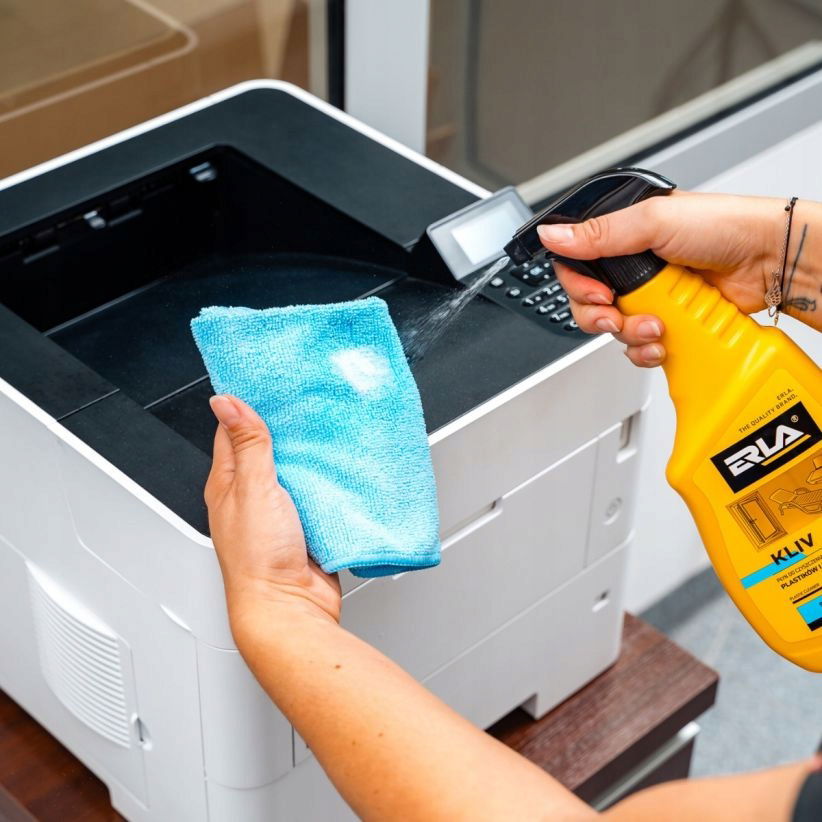 2. Spryskać powierzchnię z odległości ok. 20-30 cm. W przypadku czyszczenia urządzeń biurowych i RTV należy nanieść produkt na ściereczkę np. mikrofibrę ERLA MIFRA. W przypadku zabrudzeń w trudno dostępnych miejscach użyć szczotki szczelinowej ERLA FUGER.