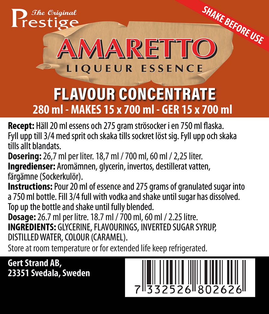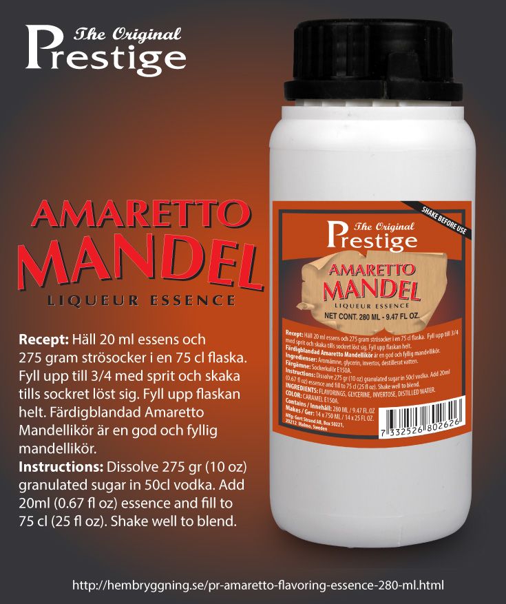 PRESTIGE Amaretto Mandel to esencja, dzięki której możesz stworzyć wyjątkowy likier migdałowy o słodkim, lekko gorzkawym smaku charakterystycznym dla włoskiego Amaretto.