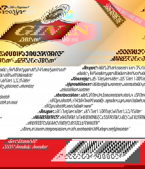 PRESTIGE Gin to esencja, która umożliwia w prosty sposób stworzenie aromatycznego ginu o klasycznym smaku jałowca. Jest to idealna baza do drinków, takich jak gin z tonikiem, martini czy koktajle na bazie grejpfruta lub Schweppesa.