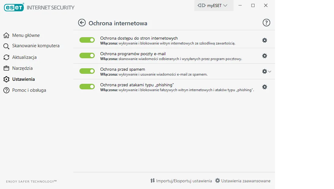 - ESET Security Essential zapewnia ochronę w czasie rzeczywistym przed wirusami, trojanami, spyware, ransomware i innymi zagrożeniami.