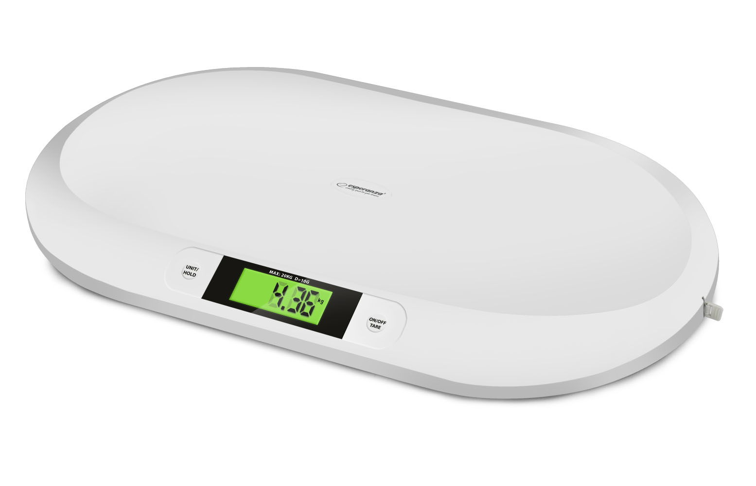 Nowoczesna, elektroniczna waga dla niemowląt, dzięki której możesz kontrolować wagę dziecka. Waga zawiera też miarkę, by kontrolować długość dziecka. Regularne sprawdzanie wagi dziecka pomaga nadzorować jego prawidłowy rozwój. Czytelny wyświetlacz wyświetlacz ciekłokrystaliczny ułatwia odczytywanie wskazań. Urządzenie posiada funkcję tarowania oraz funkcję HOLD ułatwiającą zważenie ruchliwego niemowlęcia. Ergonomiczny kształt wagi zapewnia dziecku wygodę i bezpieczeństwo podczas ważenia. Waga dla niemowląt Esperanza, to najlepszy sposób, aby monitorować rozwój i zdrowie dziecka.