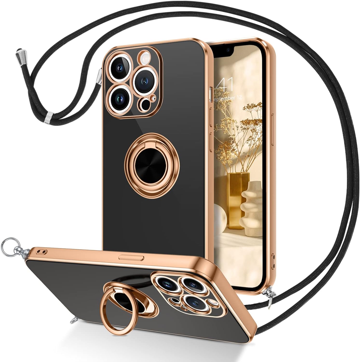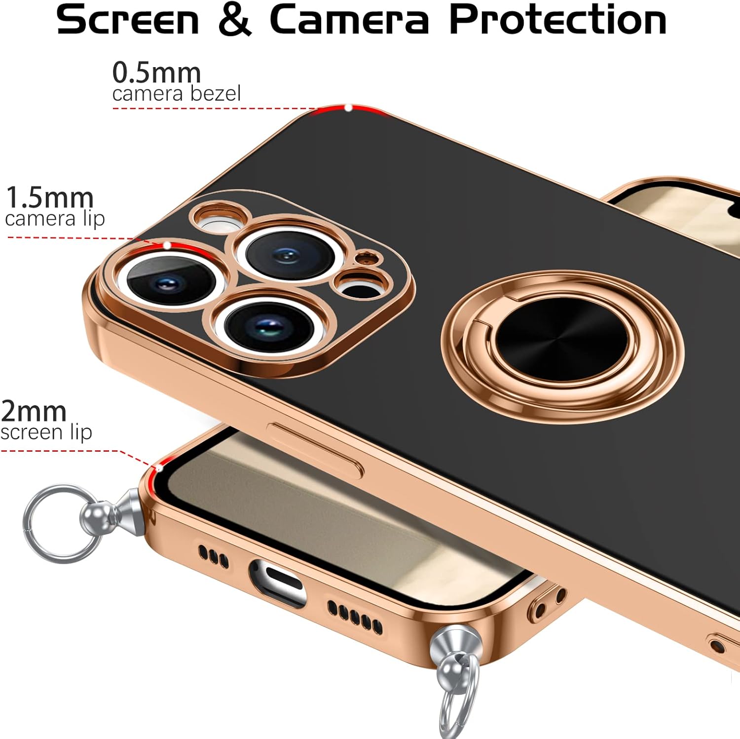 ETUI APPLE IPHONE 13 PRO SILIKONOWE CZARNE ZŁOTA RAMKA +RING I SMYCZ