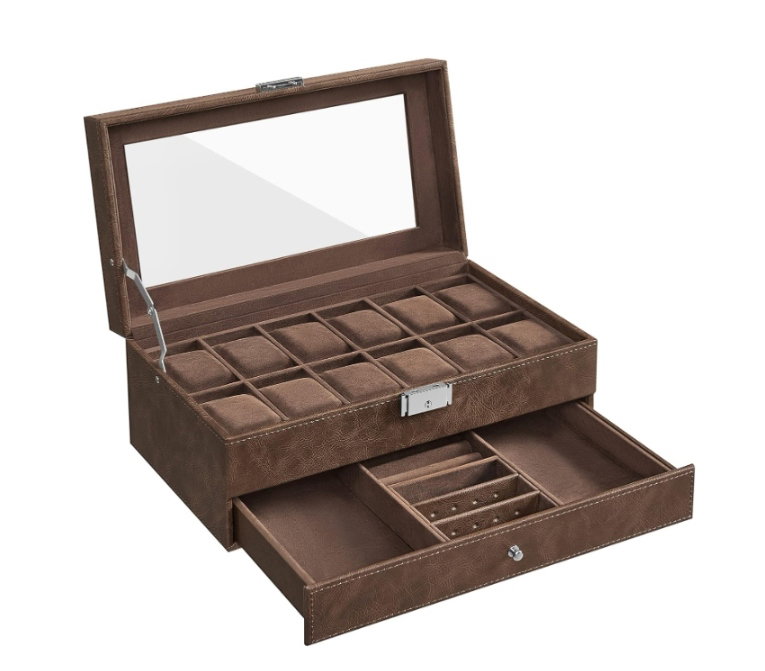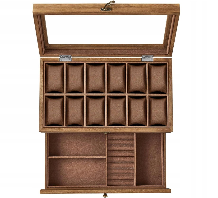 - ✴️[2 warstwy, duża pojemność] Przechowuj zegarki w 12 przegródkach górnej warstwy i uporządkuj paski do zegarków, pierścionki i spinki do mankietów w różnych przegródkach dolnej szuflady - to 2-poziomowe pudełko na zegarek pomieści Twoje skarby w jednym wygodnym miejscu