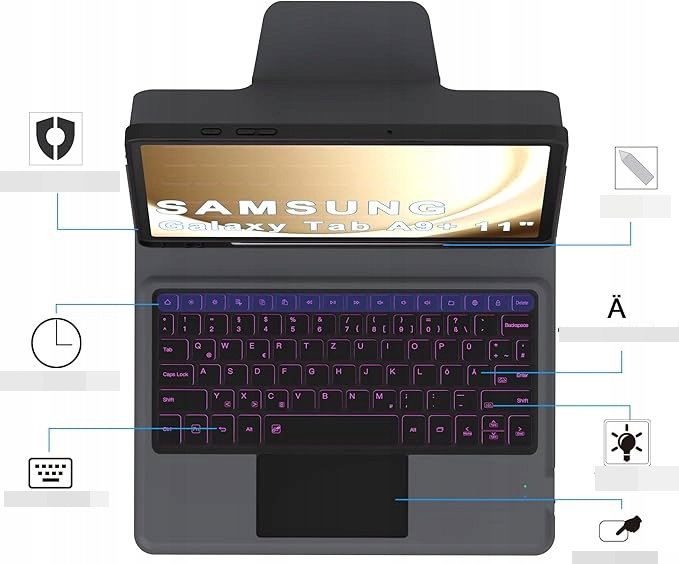 Zmień swój Samsung Galaxy Tab A9+ (SM-X210/X216/X218) w funkcjonalnego laptopa dzięki eleganckiemu etui z bezprzewodową klawiaturą Bluetooth i wielofunkcyjnym gładzikiem (touchpadem). Idealne rozwiązanie do pracy, nauki i codziennego użytku – zarówno w domu, jak i w podróży.