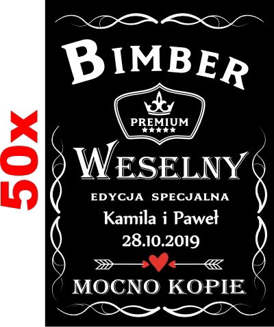 Aukcja obejmuje komplet 50szt nakielek na Bimber Weselny,