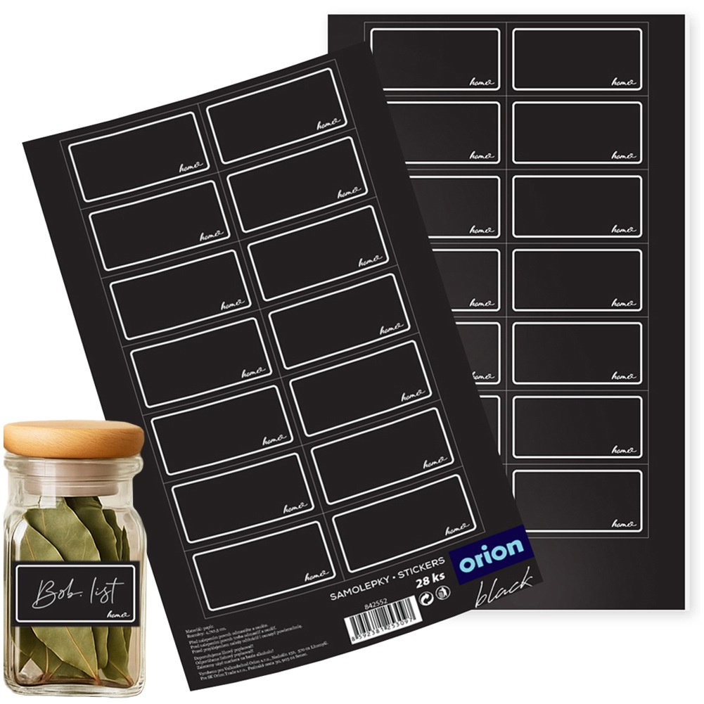 Zestaw 28 szt. naklejek na słoiki - Zestaw 28 szt. prostokątnych etykiet samoprzylepnych. Każda etykieta ma wymiary 4,7 x 2,5 cm. Samoprzylepna formuła - Naklejki bez problemu przykleimy na słoiku, butelce, dzięki samoprzylepnej formule. Nie wymagają dodatkowego kleju. Wykonane z papieru - Etykiety są z laminowanego papieru w kolorze czarnym. Etykiety posiadają napis home. Estetyczny i czytelny wygląd - Każda etykieta zawiera miejsce na wpisanie treści, takich jak skład, data przygotowania czy nazwa produktu. Świetnie sprawdzą się również do podpisywania prezentów. Pomocne w organizacji przestrzeni - Etykiety ułatwiają utrzymanie porządku w kuchni, spiżarni czy szafkach. Dzięki nim z łatwością oznaczysz zawartość pojemników i słoików, co sprzyja lepszej organizacji. Zestaw 28 szt. etykiet samoprzylepnych. Naklejki świetnie sprawdzą się do podpisywania słoików, butelek, ale również pojemników z przyprawami oraz szafek i prezentów. Pomogą utrzymać porządek w domowej spiżarni. Dzięki nim podpisane słoiki, pojemniki prezentują się bardzo elegancko i mogą stanowić element dekoracyjny. Oryginalny produkt czeskiej marki Orion. Wyprodukowano zgodnie z europejskimi standardami.