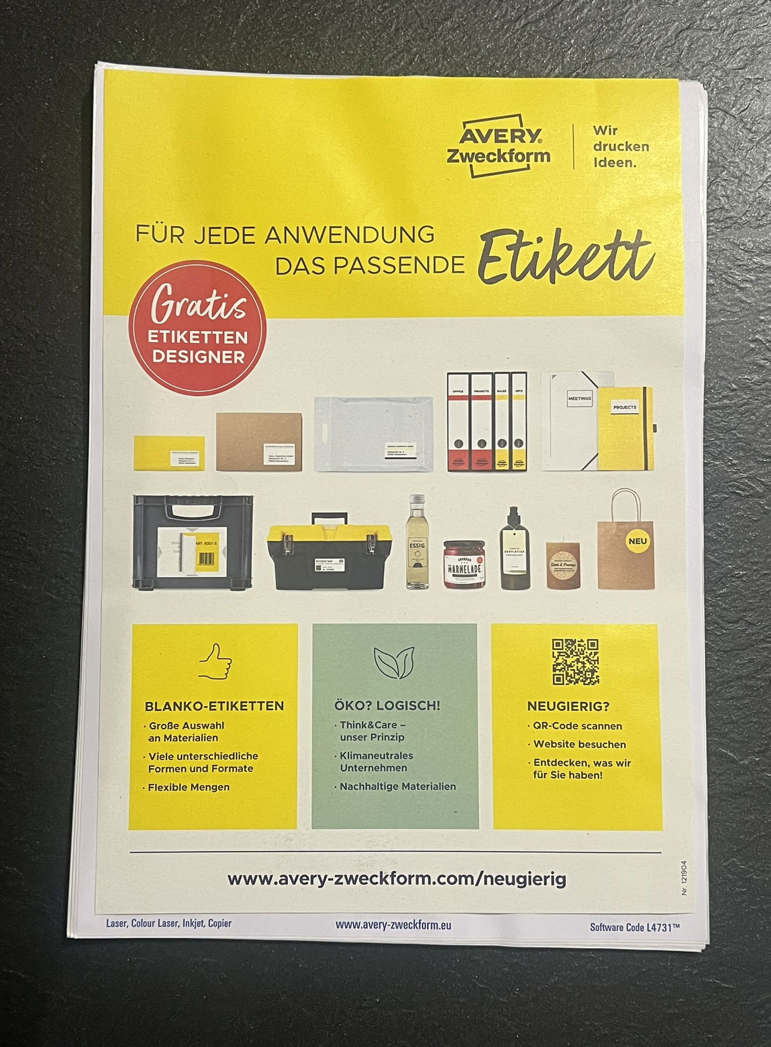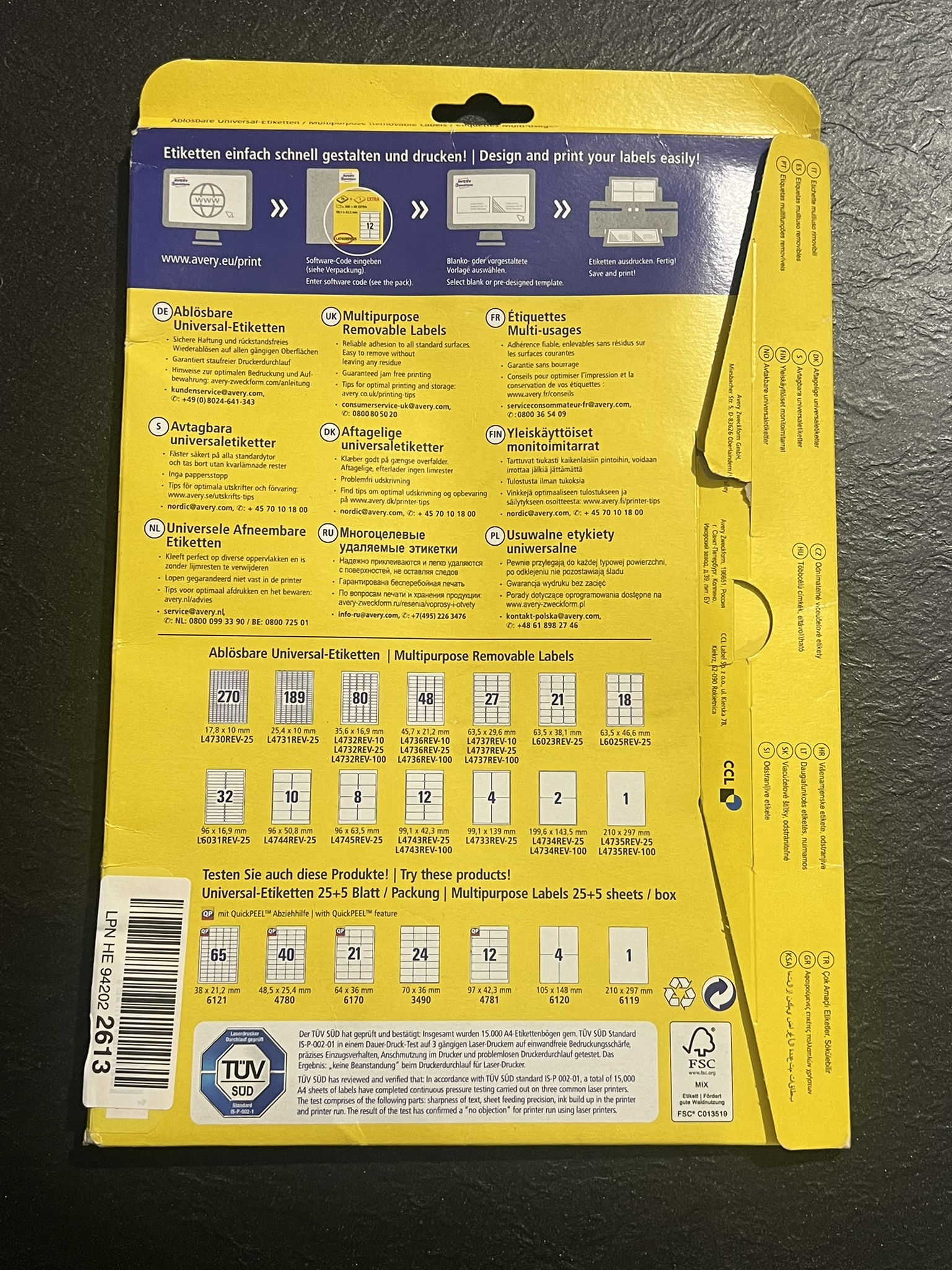 Po prostu zaprojektuj i wydrukuj puste etykiety samodzielnie, korzystając z bezpłatnych szablonów online firmy AVERY Zweckform — link znajdziesz na opakowaniu produktu lub na stronie internetowej firmy AVERY Zweckform