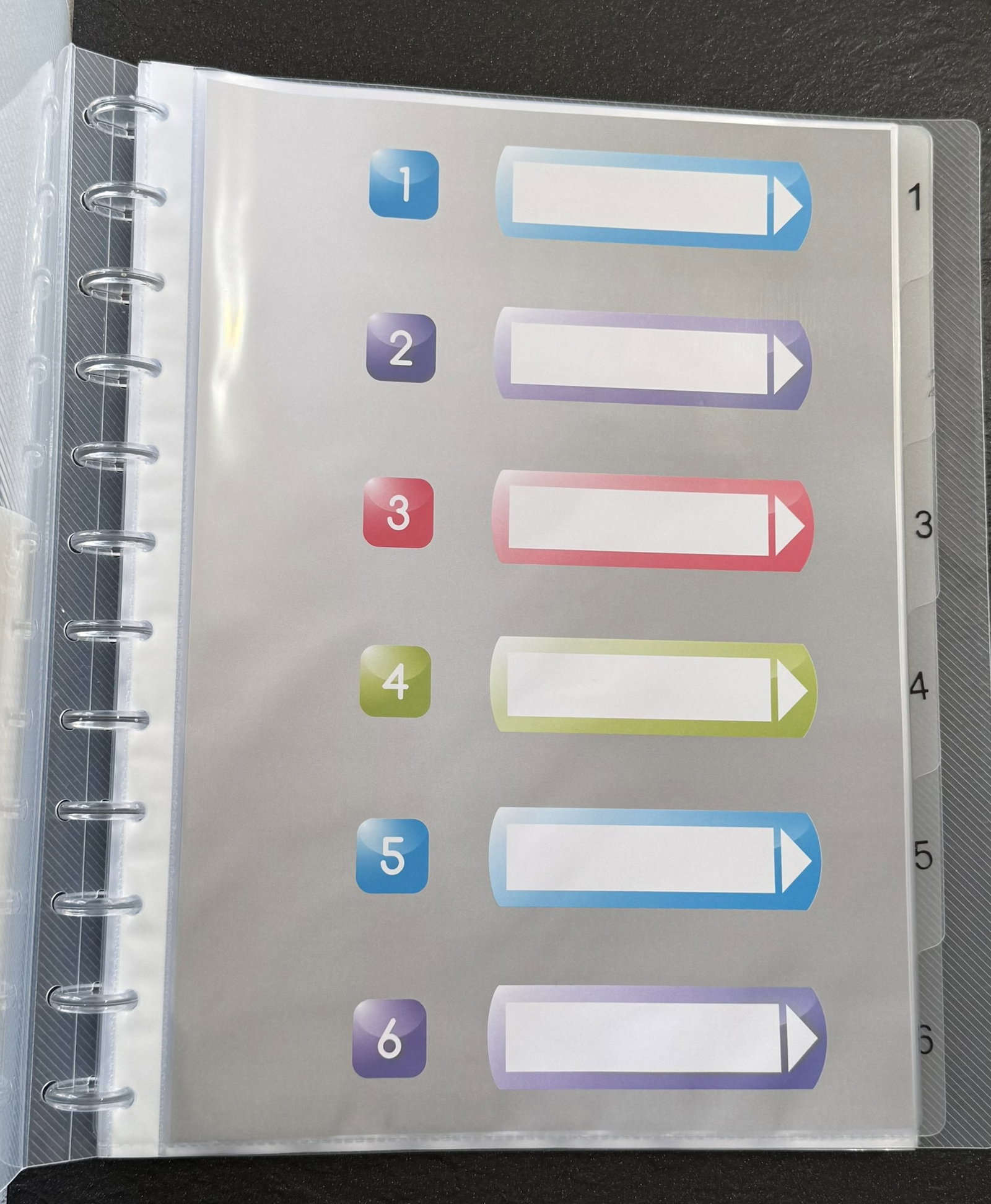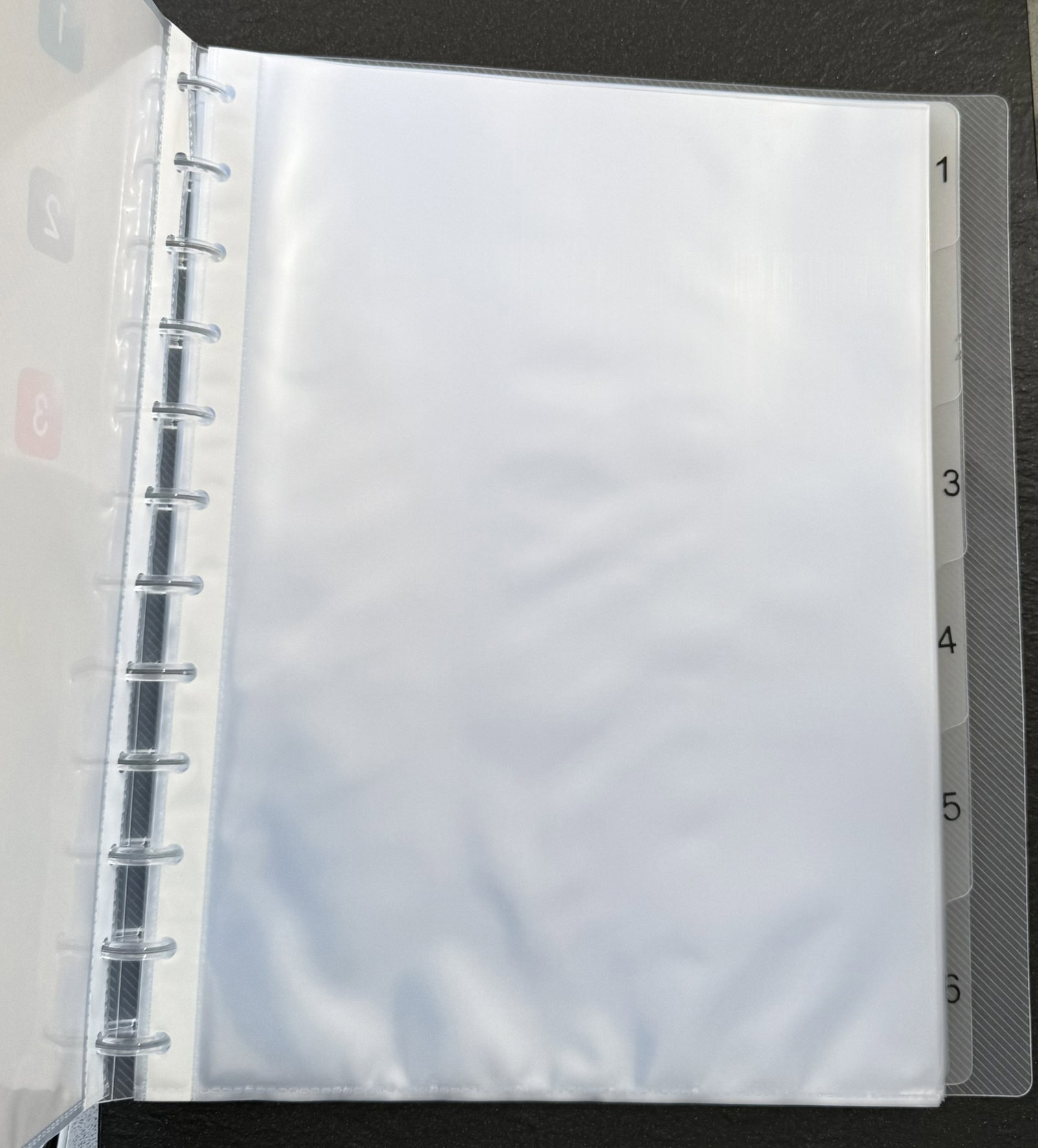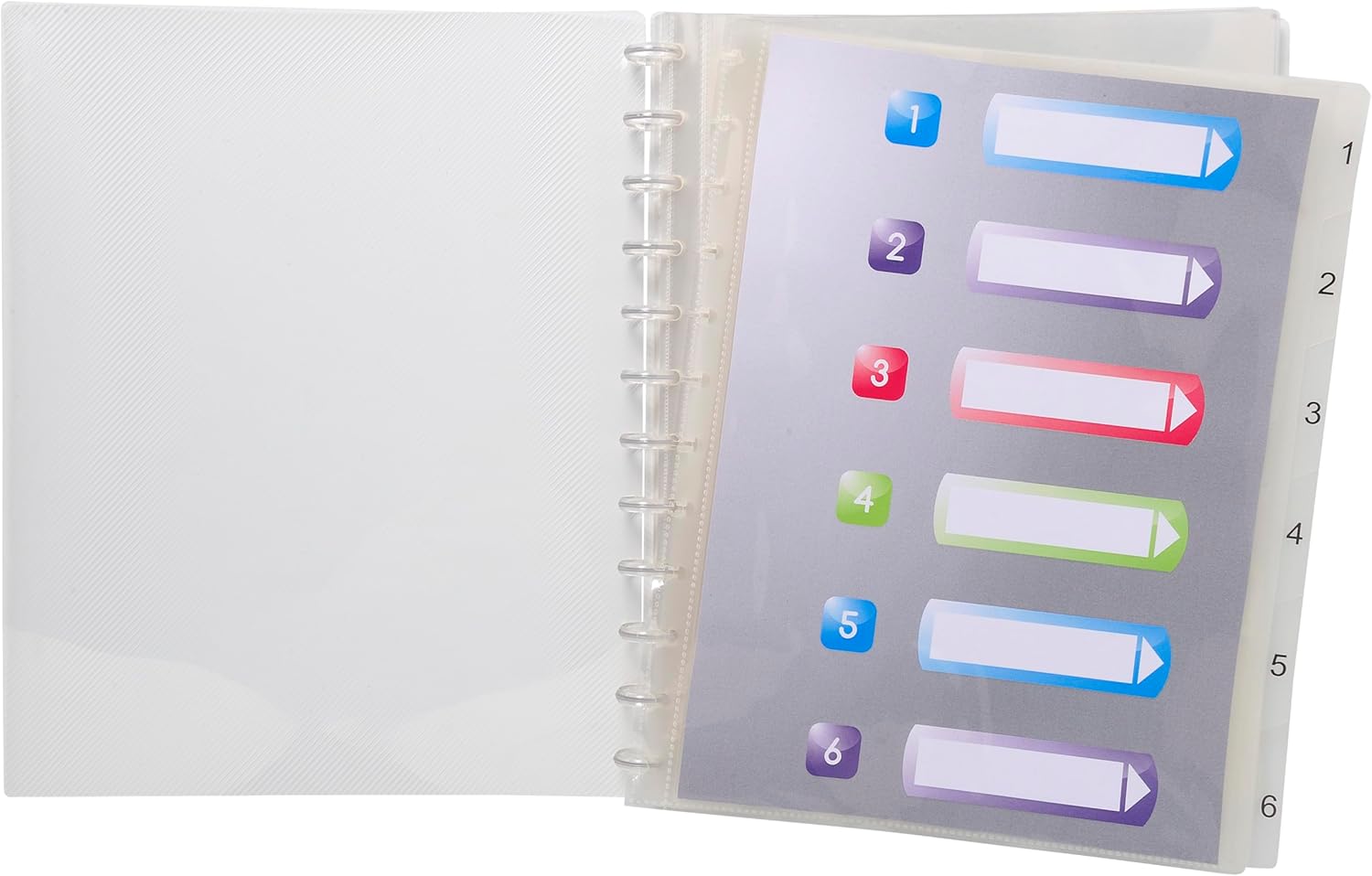 Ten album ringowy posiada odpinane kieszenie i sztywne półprzezroczyste przekładki ponumerowane od 1 do 6