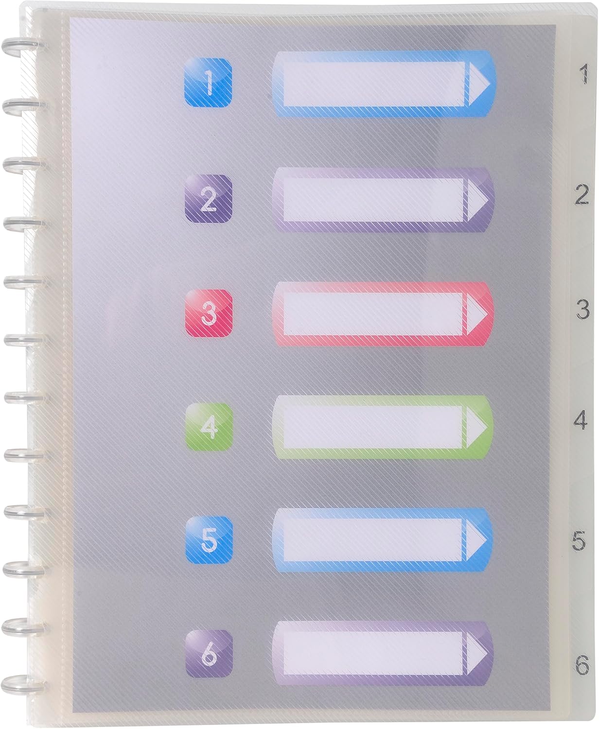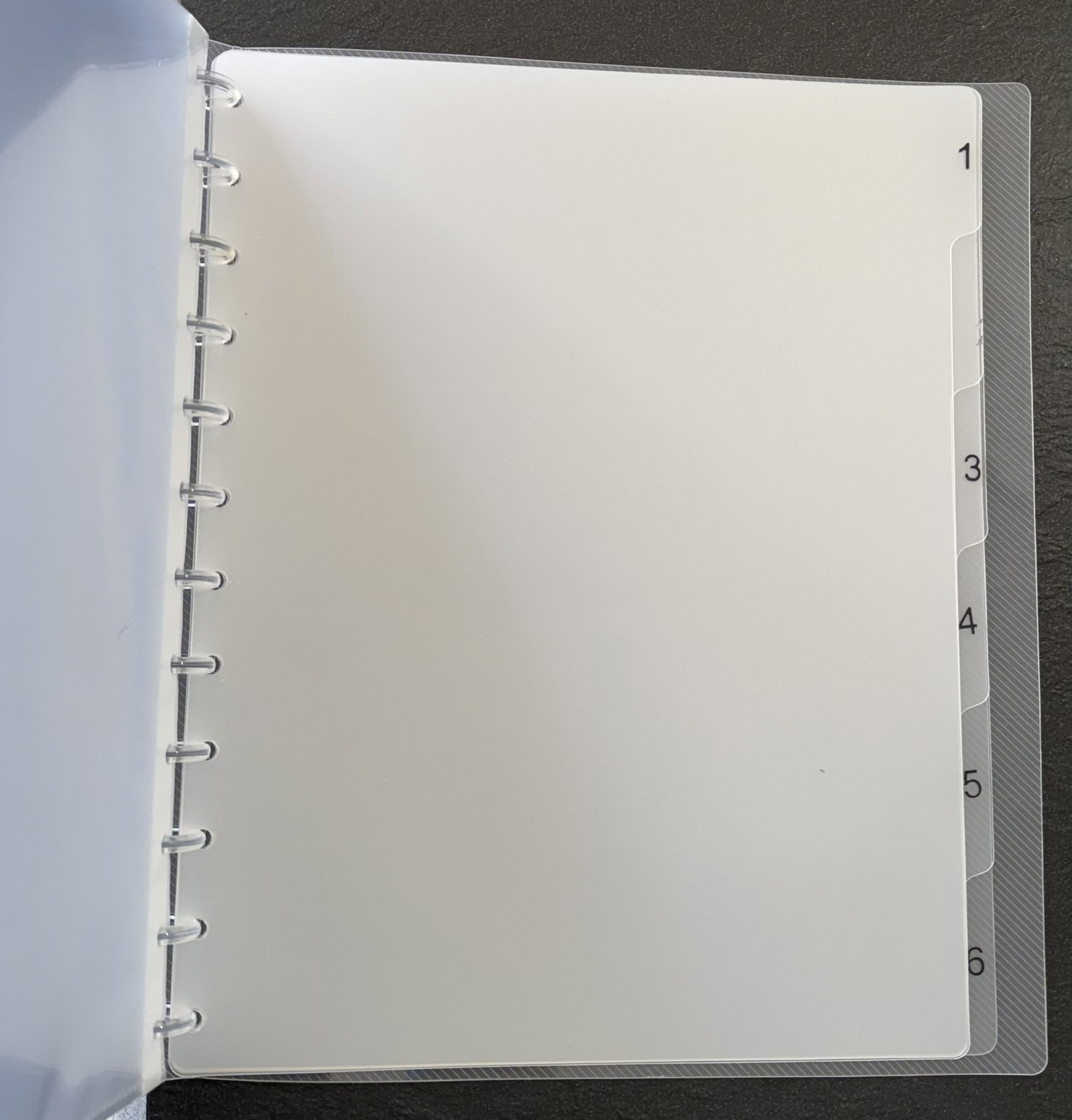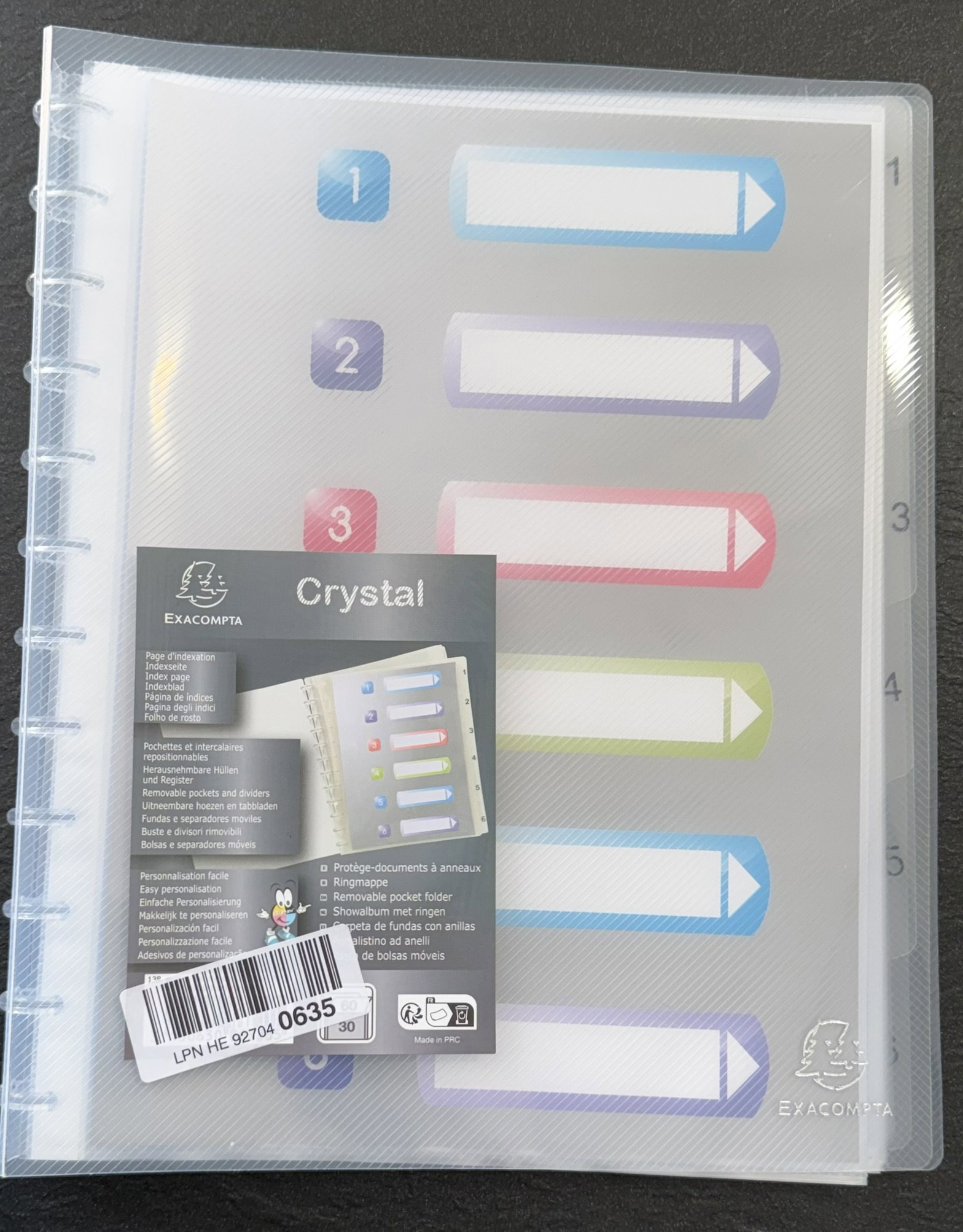 Ten album ringowy posiada odpinane kieszenie i sztywne półprzezroczyste przekładki ponumerowane od 1 do 6