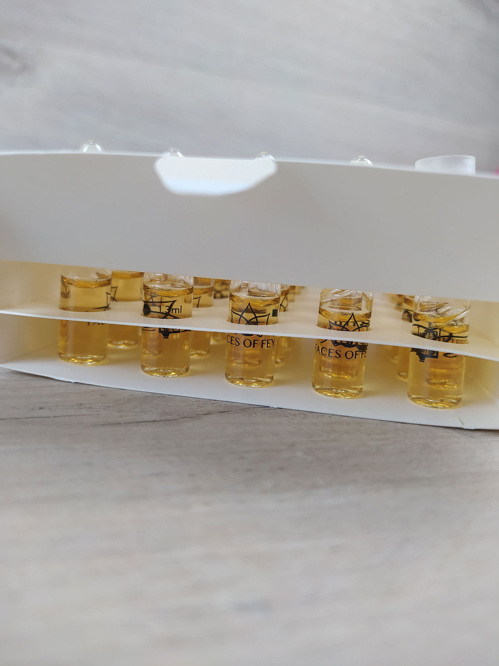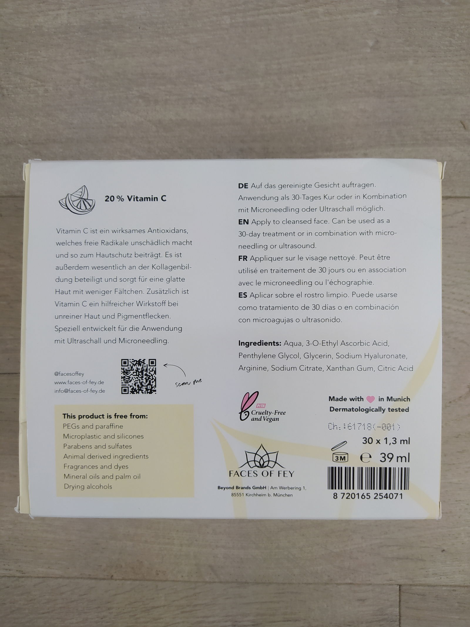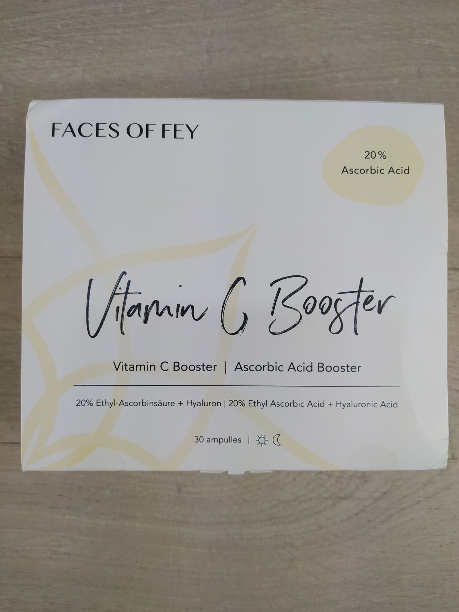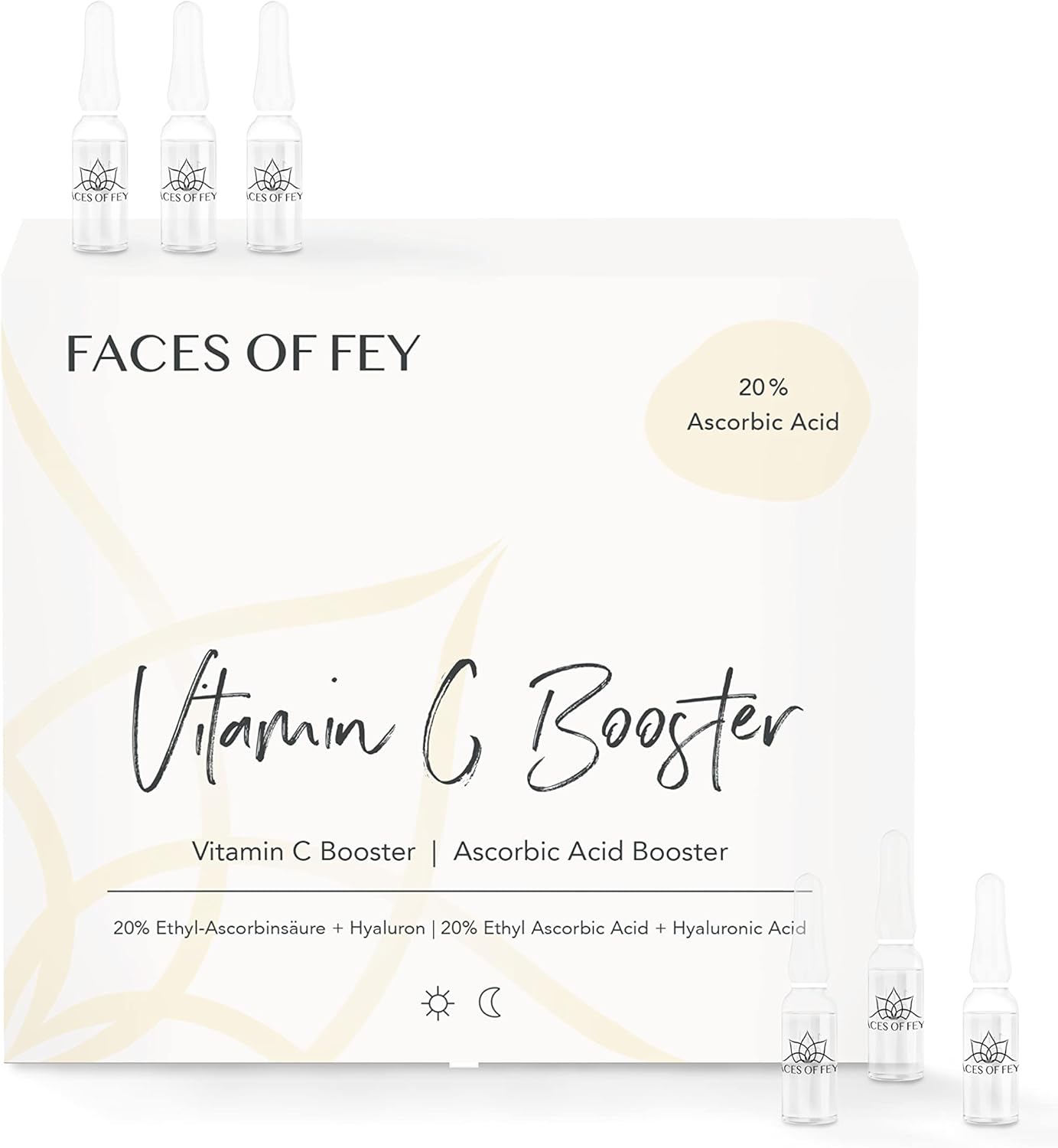 Ampułki wzmacniające witaminę C od Faces of Fey są pełne cennej witaminy C i dlatego są idealne do stosowania na zanieczyszczoną skórę, plamy pigmentacyjne i pryszcze. Witamina C jest bardzo skutecznym przeciwutleniaczem, który neutralizuje wolne rodniki i pomaga chronić skórę. Stymuluje również produkcję kolagenu w organizmie i przeciwdziała przedwczesnemu starzeniu się skóry. Booster zawiera 20% kwasu 3-O-etylo-askorbinowego. W przeciwieństwie do innych pochodnych witaminy C nie musi być przekształcany w kwas askorbinowy, ale jest gotowy do natychmiastowego użycia.