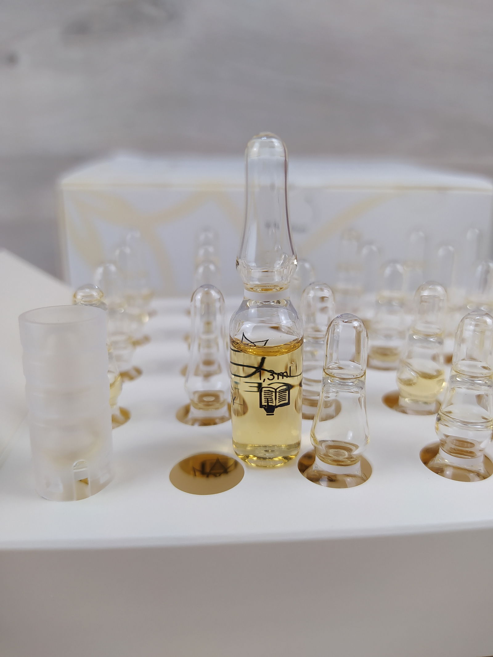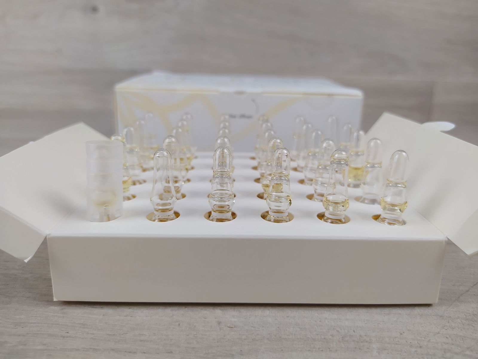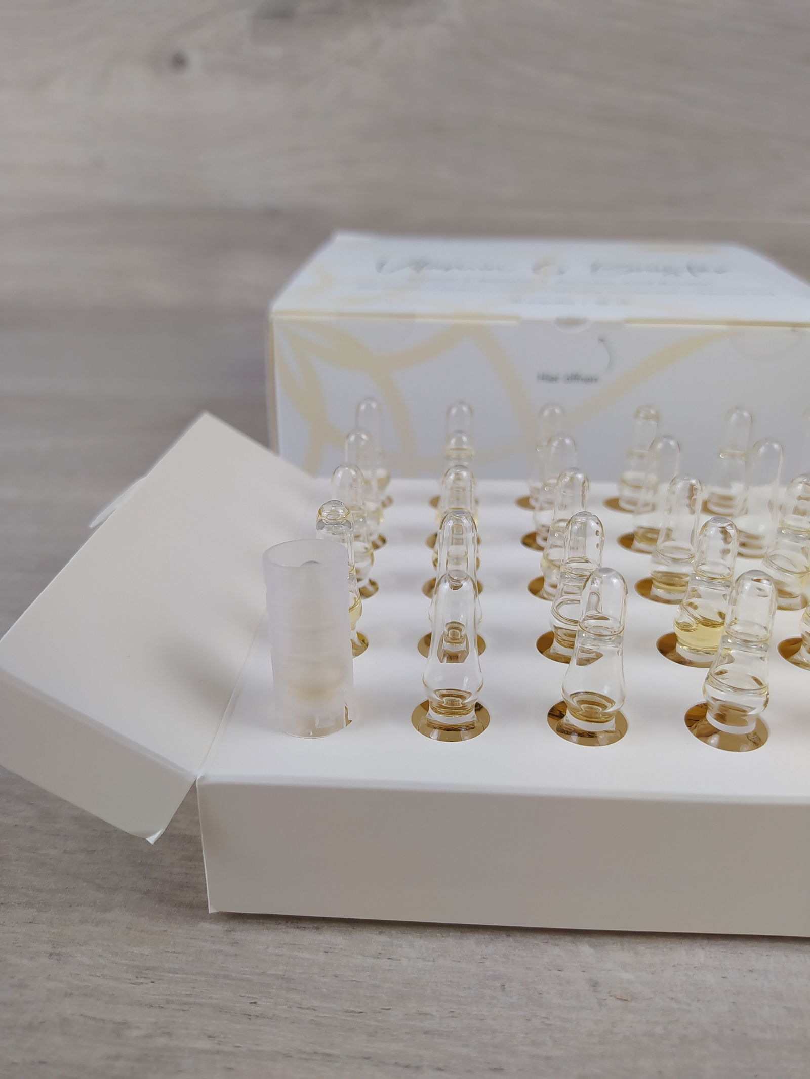 Wstrząsnąć ampułkę przed użyciem, tak aby cały płyn znajdował się w dolnej części. Następnie użyj załączonego przerywacza ampułek i ostrożnie otwórz ampułkę. Gdy tylko ampułka zostanie otwarta, można pozwolić kapać wzmacniaczowi na dłoń. Może być konieczne lekkie stuknięcie ampułki, aby płyn spłynął. Nałóż wzmacniacz na twarz palcami i delikatnie wklep. Alternatywnie, wzmacniacz można również wprowadzić w skórę za pomocą dermarollera lub ultradźwięków.