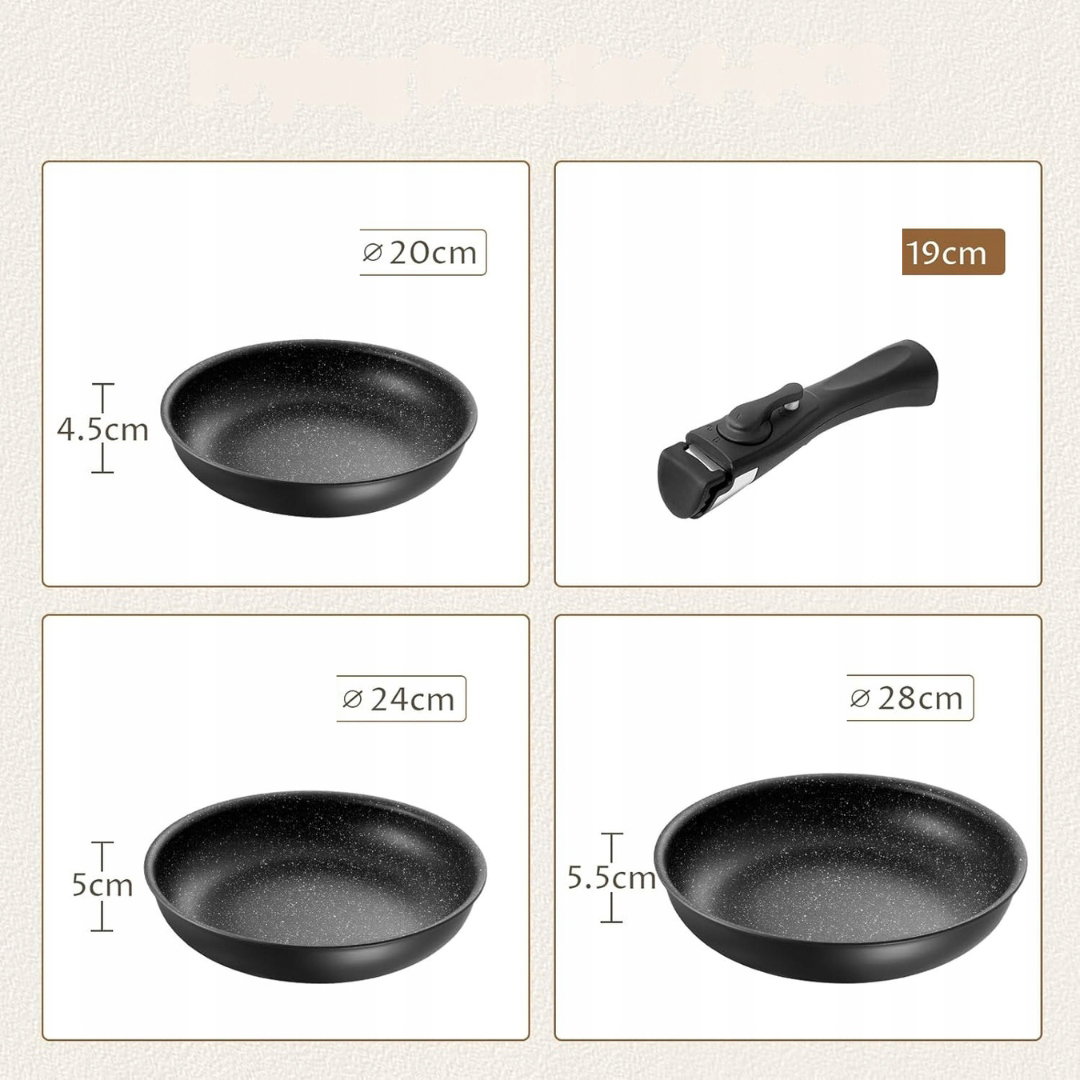 - Zawartość zestawu: w komplecie znajdują się patelnie o średnicach 20 cm, 24 cm i 28 cm oraz jeden odłączany uchwyt, który zwiększa funkcjonalność i ułatwia przechowywanie.